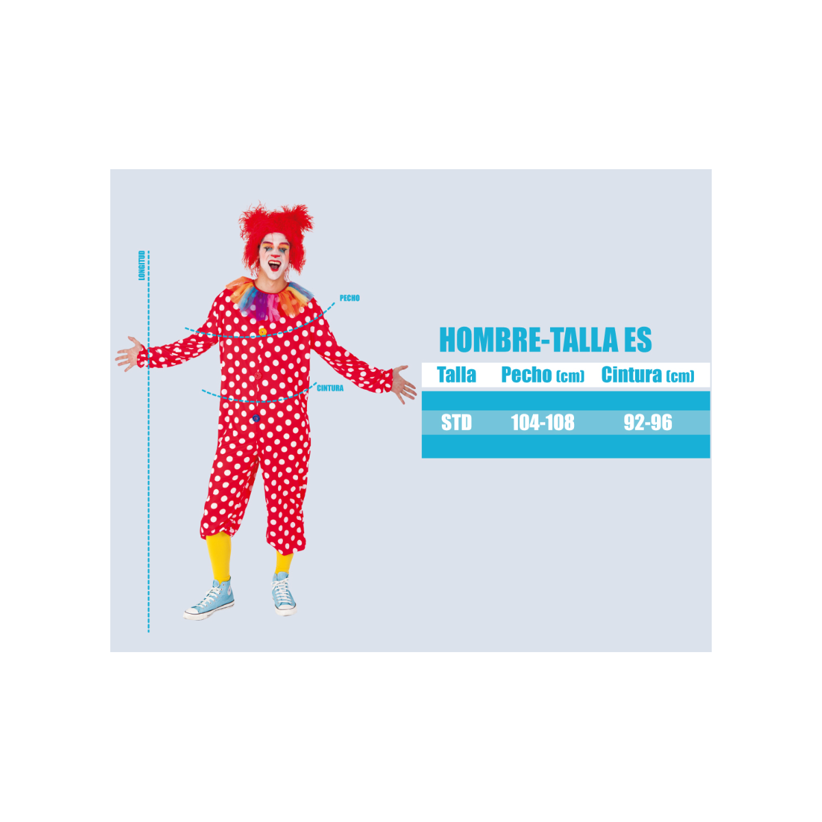 - Medidas: Pecho (104-108 cm) y cintura (92-96 cm).