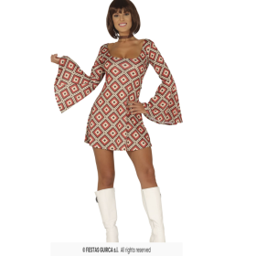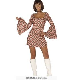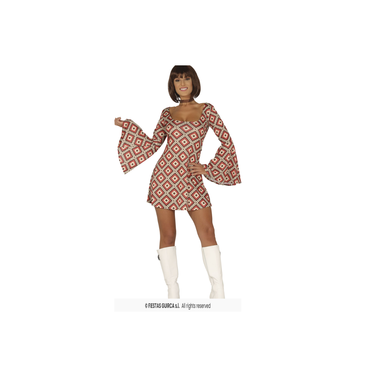 Descubre el Disfraz Reina de la Pista Años 70, con estampado geométrico, ideal para brillar en Carnaval y fiestas temáticas.