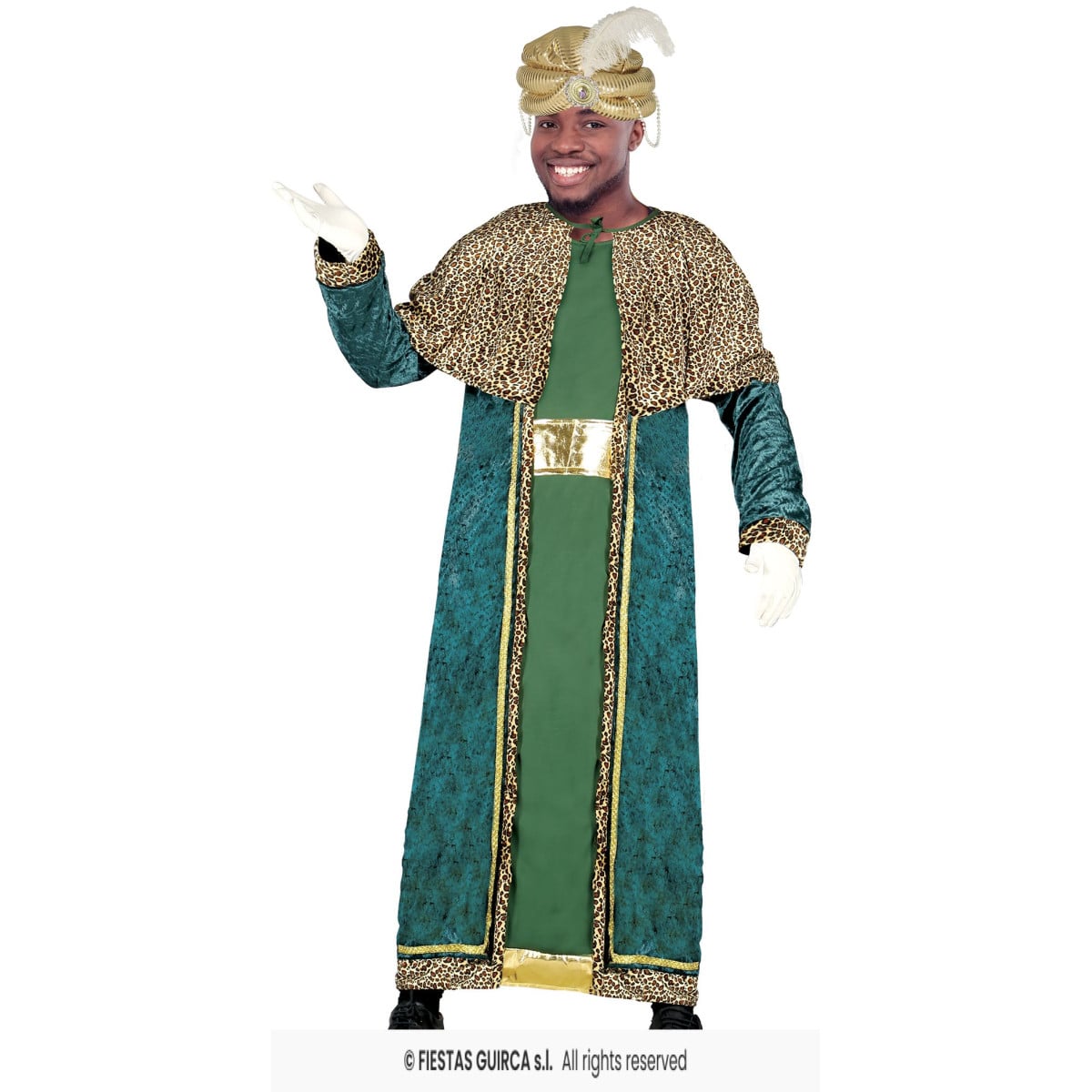 Disfraz de Rey Baltasar para adulto con túnica verde, capa animal print y turbante dorado. Elegante y vistoso, perfecto para cabalgatas y celebraciones navideñas.