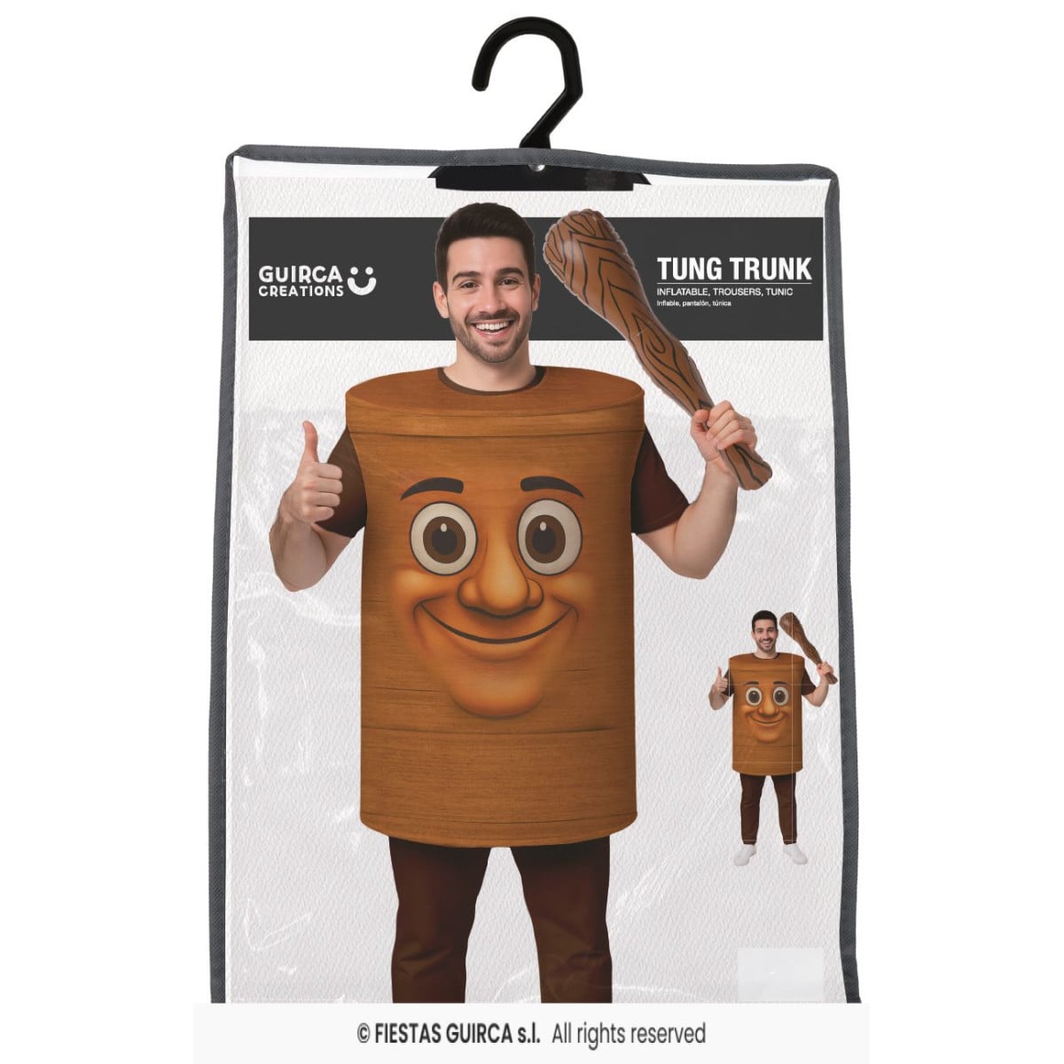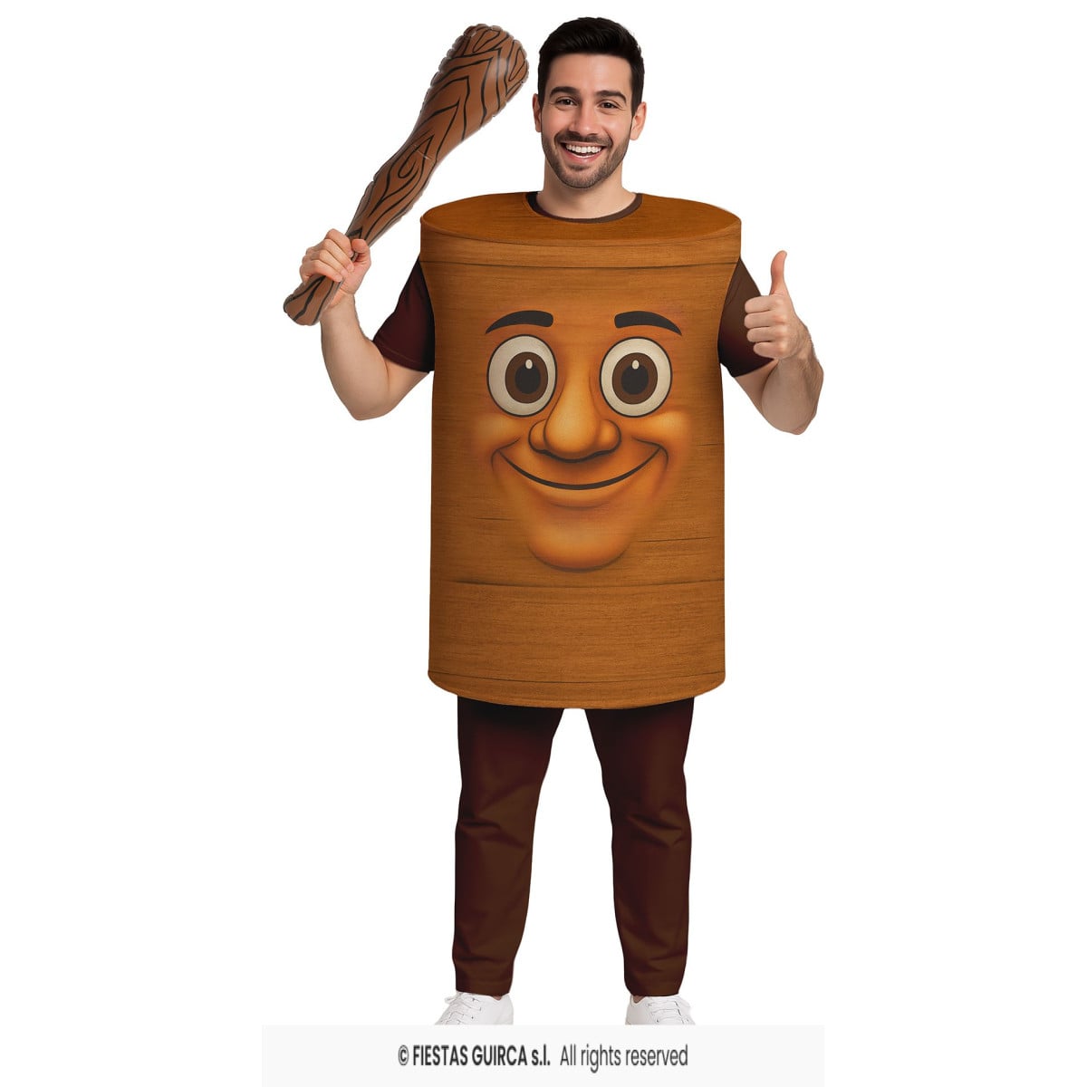 El disfraz está formado por un cuerpo tipo túnica que simula un tronco de madera, combinado con pantalón a juego para mayor comodidad. Incluye un tronco hinchable para llevar en la mano, ligero y fácil de manejar, que completa el look sin resultar pesado. Un conjunto cómodo, llamativo y muy fácil de llevar durante toda la fiesta.