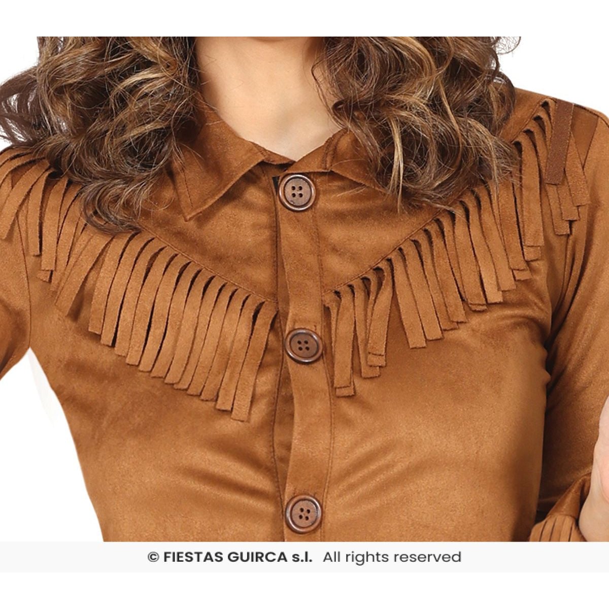 Descubre el Disfraz de Vaquera que es perfecto para destacar en cualquier evento temático con su vestido marrón que imita el ante con flecos y cinturón.