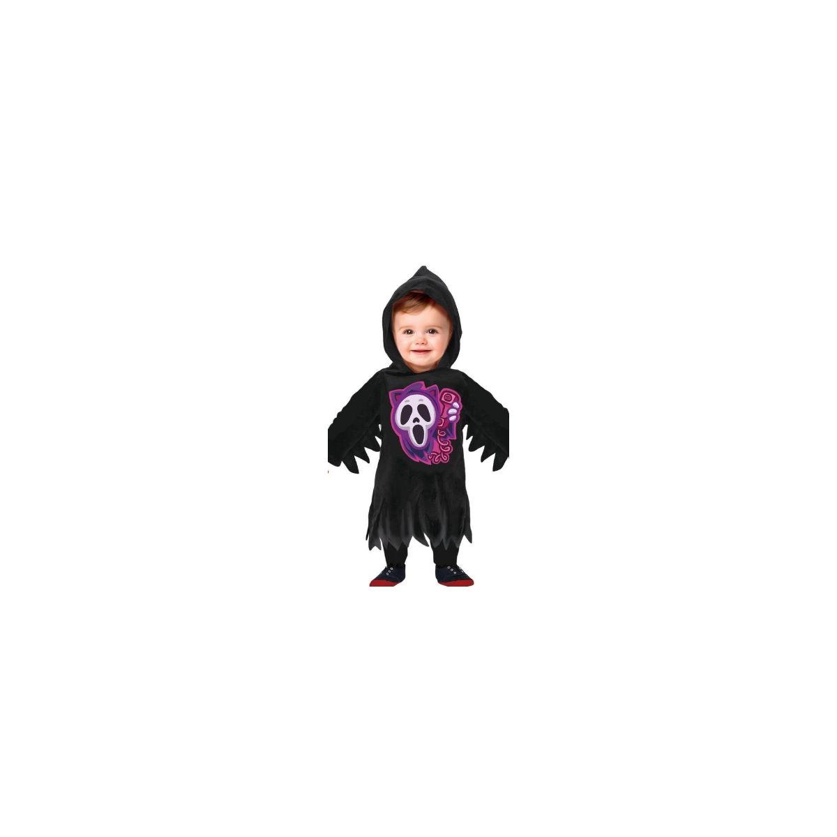 Este Disfraz De Muerte Bebé 18-24 Meses es una opción ideal para introducir a los más pequeños en la diversión de Halloween de una forma simpática y nada aterradora. Su diseño combina un estilo divertido con un toque travieso, protagonizado por un fantasma sonriente que aporta encanto y originalidad al conjunto.