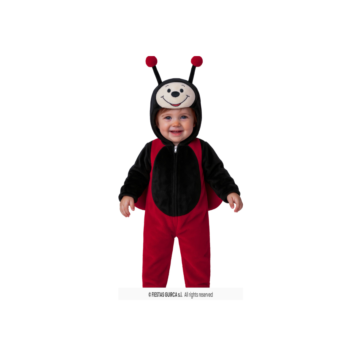 El disfraz está formado por un mono de una sola pieza que cubre el cuerpo de forma cómoda, facilitando el movimiento y permitiendo que el bebé juegue o se mueva con total libertad. Incluye alas integradas en la espalda, ligeras y suaves, que completan el look sin resultar molestas. La capucha incorpora la carita de la mariquita con antenas, aportando un acabado muy visual y especialmente pensado para sesiones de fotos y eventos familiares.