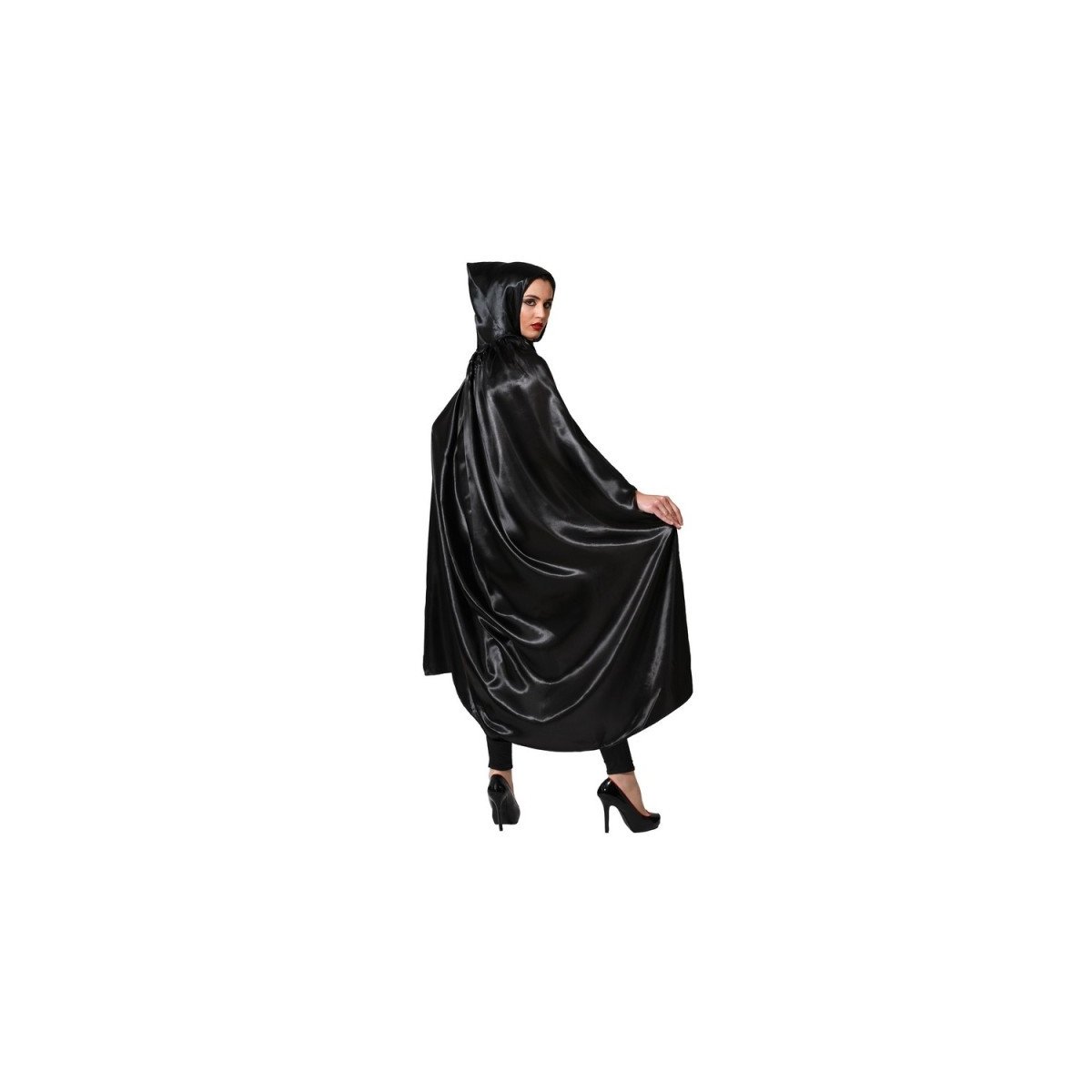 Capa negra de satén con capucha, 140 cm de largo, ideal para disfraces de Halloween o eventos temáticos.
