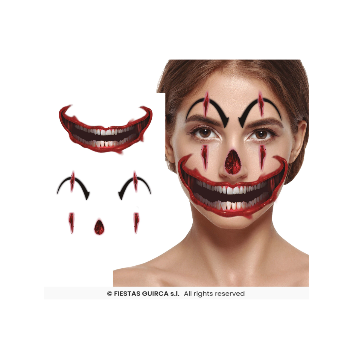 Su aplicación es sencilla y rápida, ideal para quienes buscan un resultado llamativo sin esfuerzo. El diseño incluye detalles de cicatrices, sonrisas siniestras y efectos de sangre, aportando un acabado terrorífico que se mantiene durante toda la celebración. Además, al ser un tatuaje temporal, puedes retirarlo con facilidad después de la fiesta sin dejar residuos.