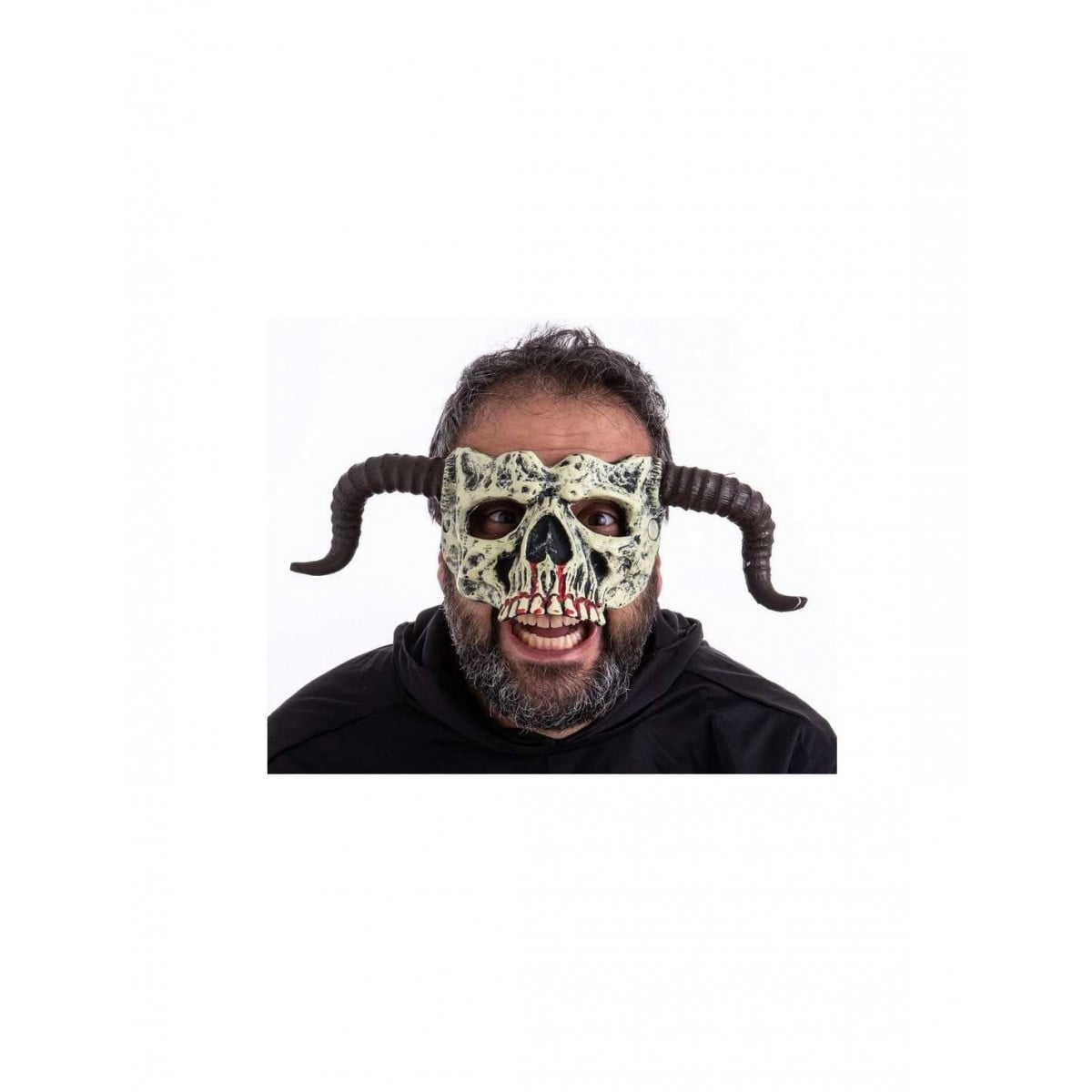 A modo de antifaz, te cubrirá desde la frente hasta debajo de la nariz. Después, del esqueleto salen unos cuernos hacia abajo.