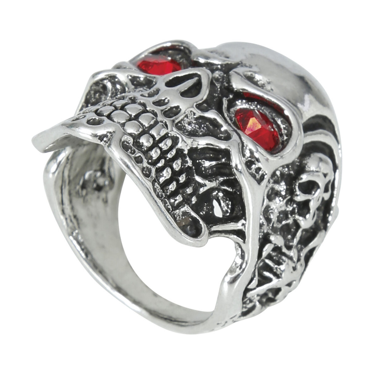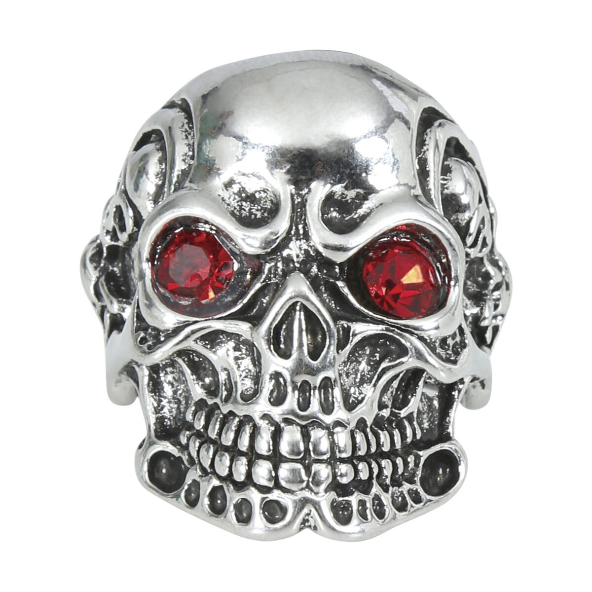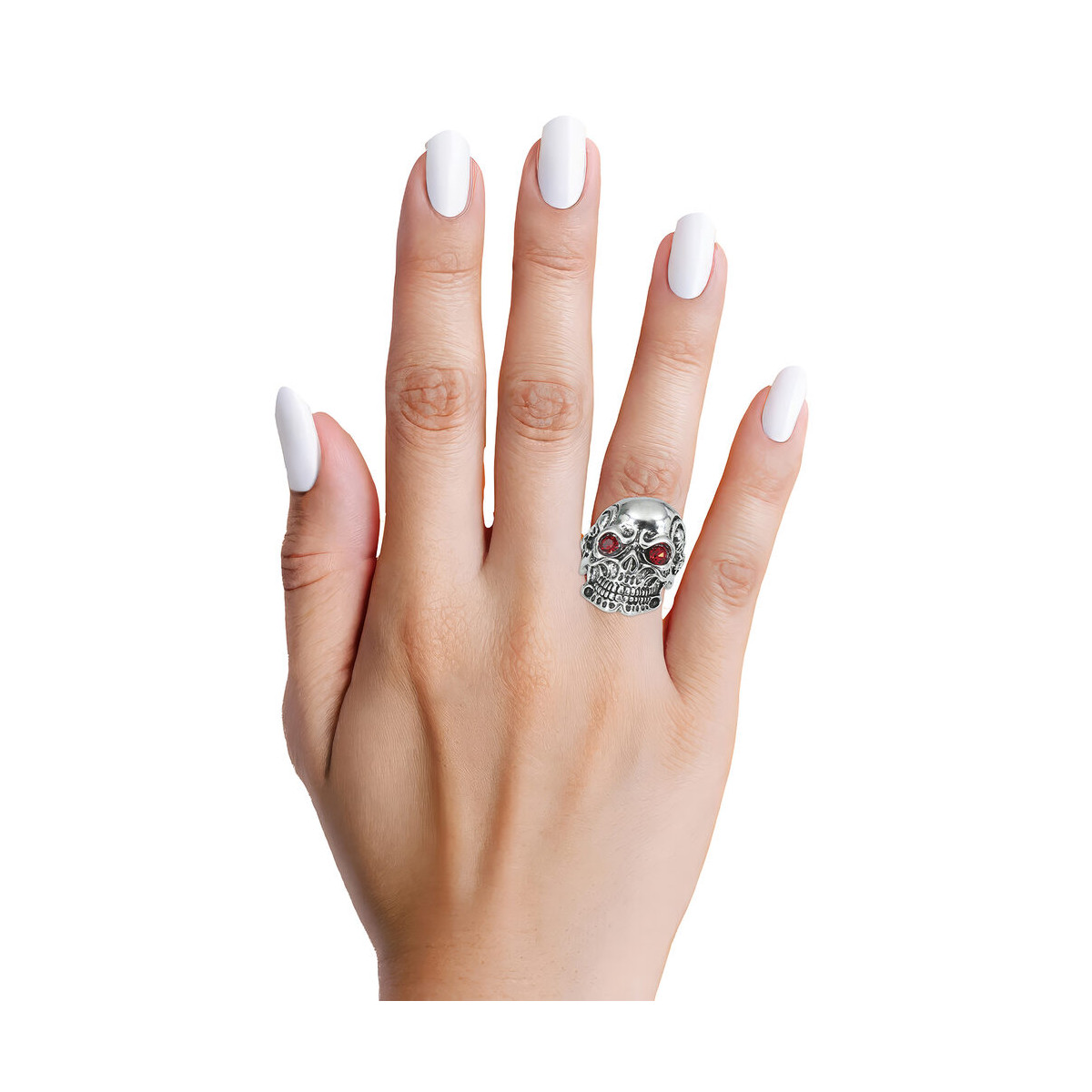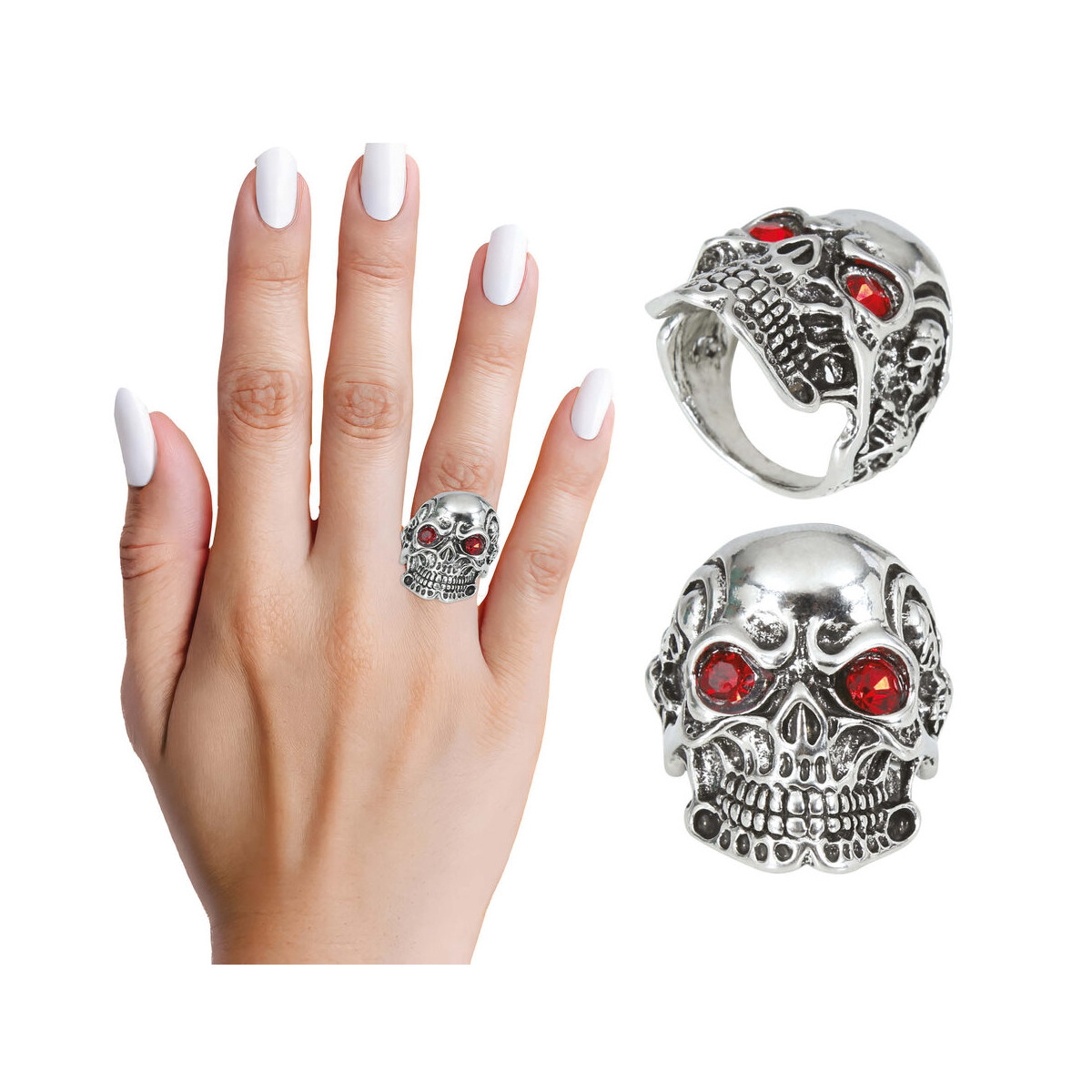 La calavera, símbolo de fuerza y misterio, está esculpida en metal con gran detalle, desde los dientes hasta las hendiduras que dan volumen al diseño. Lo que realmente lo hace especial son los ojos rojos en relieve, que simulan piedras incrustadas y le otorgan un efecto intenso y llamativo. Al colocarlo, la mirada se centra de inmediato en tu mano, convirtiéndose en el centro de todas las miradas.