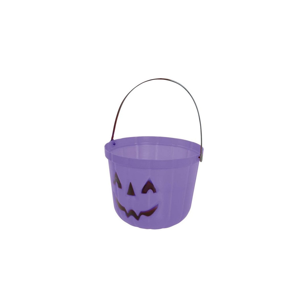 Alegra tu Halloween con el cubo calabaza de 20 cm en colores surtidos lila y negro. Perfecto para dulces y decoración, añadiendo un toque espeluznante.