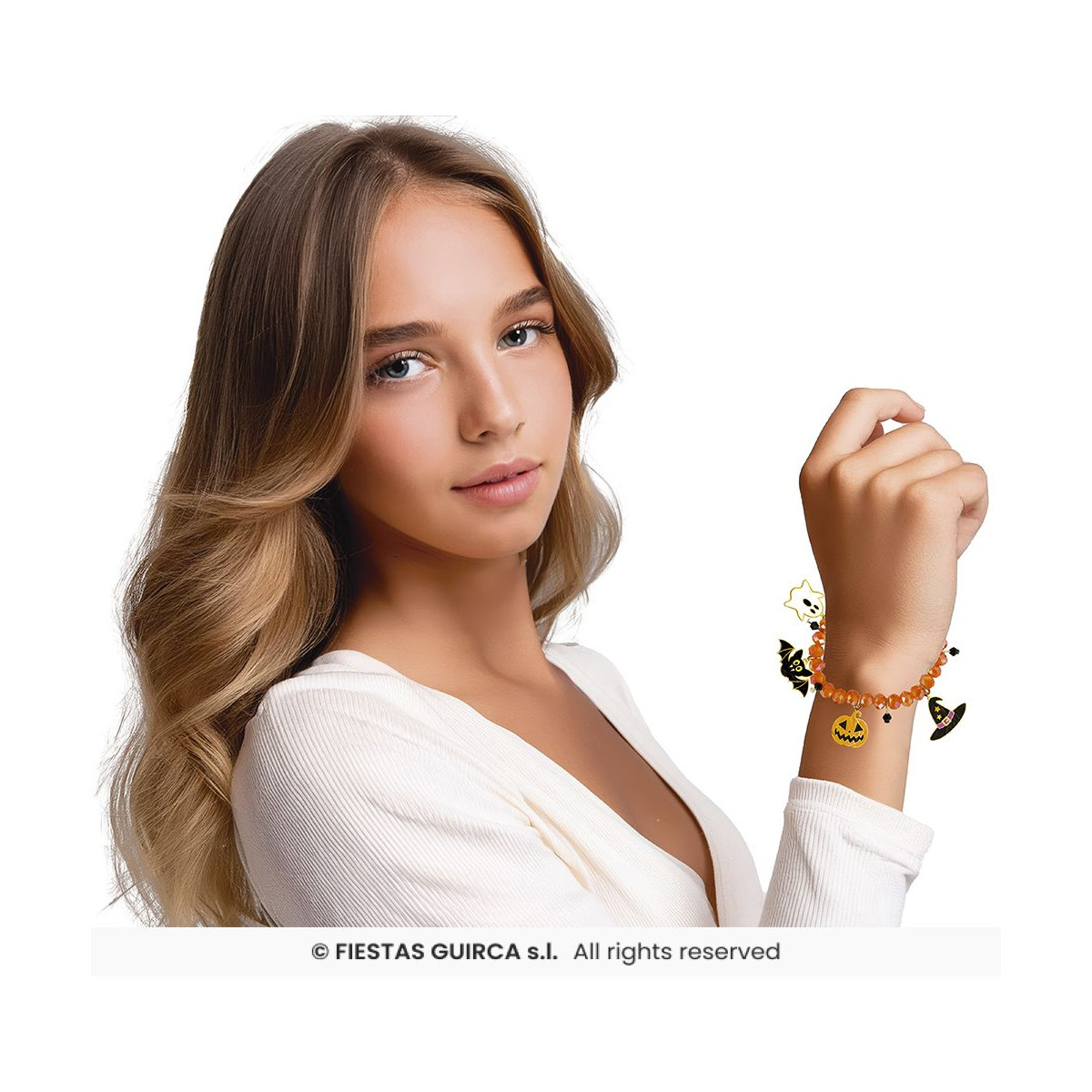 Entre sus adornos encontrarás figuras clásicas de Halloween como un murciélago, una calabaza sonriente, un simpático fantasma y un sombrero de bruja. Cada uno de estos detalles aporta personalidad a la pulsera, evocando el ambiente misterioso y festivo propio de esta celebración. Gracias a su diseño llamativo, puede llevarse tanto en fiestas temáticas como en el día a día durante el mes de octubre, convirtiéndose en un accesorio versátil que complementa disfraces o conjuntos casuales.