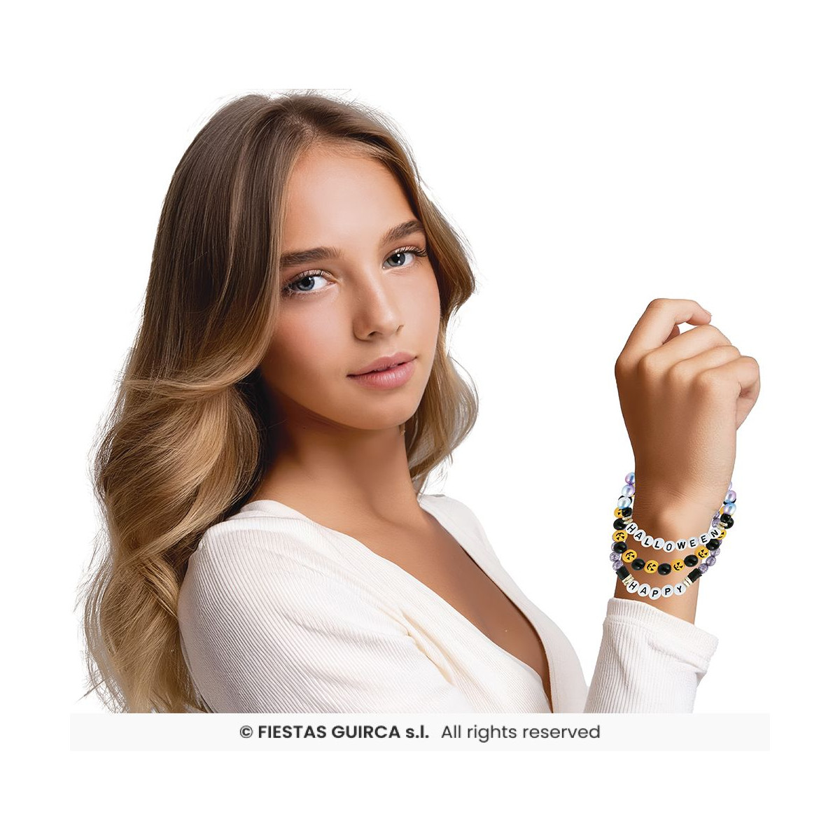 Cada pulsera tiene un diseño diferente que combina colores característicos de la temporada como el naranja, negro y morado, junto con detalles brillantes y cuentas con letras. Algunas incluyen mensajes como “Happy” o “Halloween”, mientras que otras destacan por sus cuentas decoradas con simpáticas calabazas que evocan la noche de los disfraces y la magia de las fiestas temáticas. Gracias a su diseño variado, este set permite llevar las tres juntas para un look llamativo o usarlas por separado para un estilo más discreto, según la ocasión.