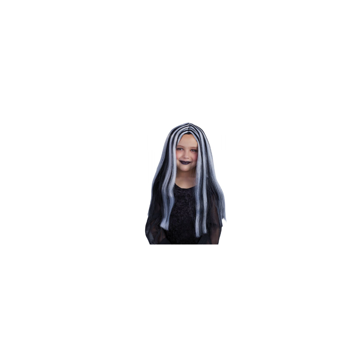Transforma tu look en uno mágico y espeluznante con la peluca de brujita negra con mechas blancas, perfecta para Halloween y fiestas temáticas.