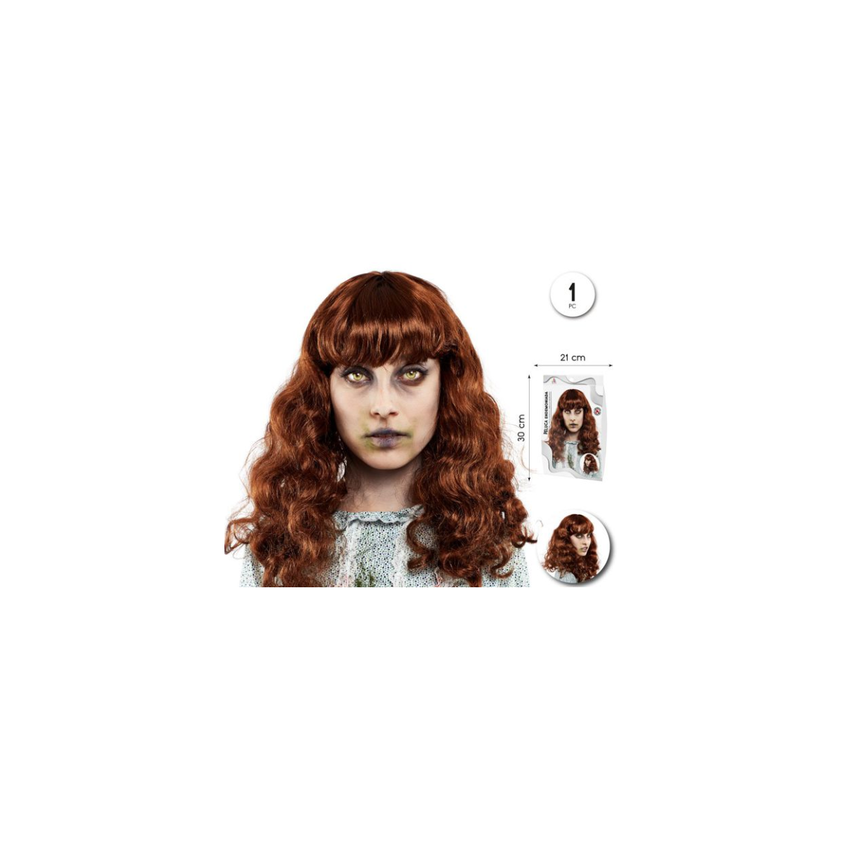 - Peluca sintética en tono rojizo con rizos y flequillo.