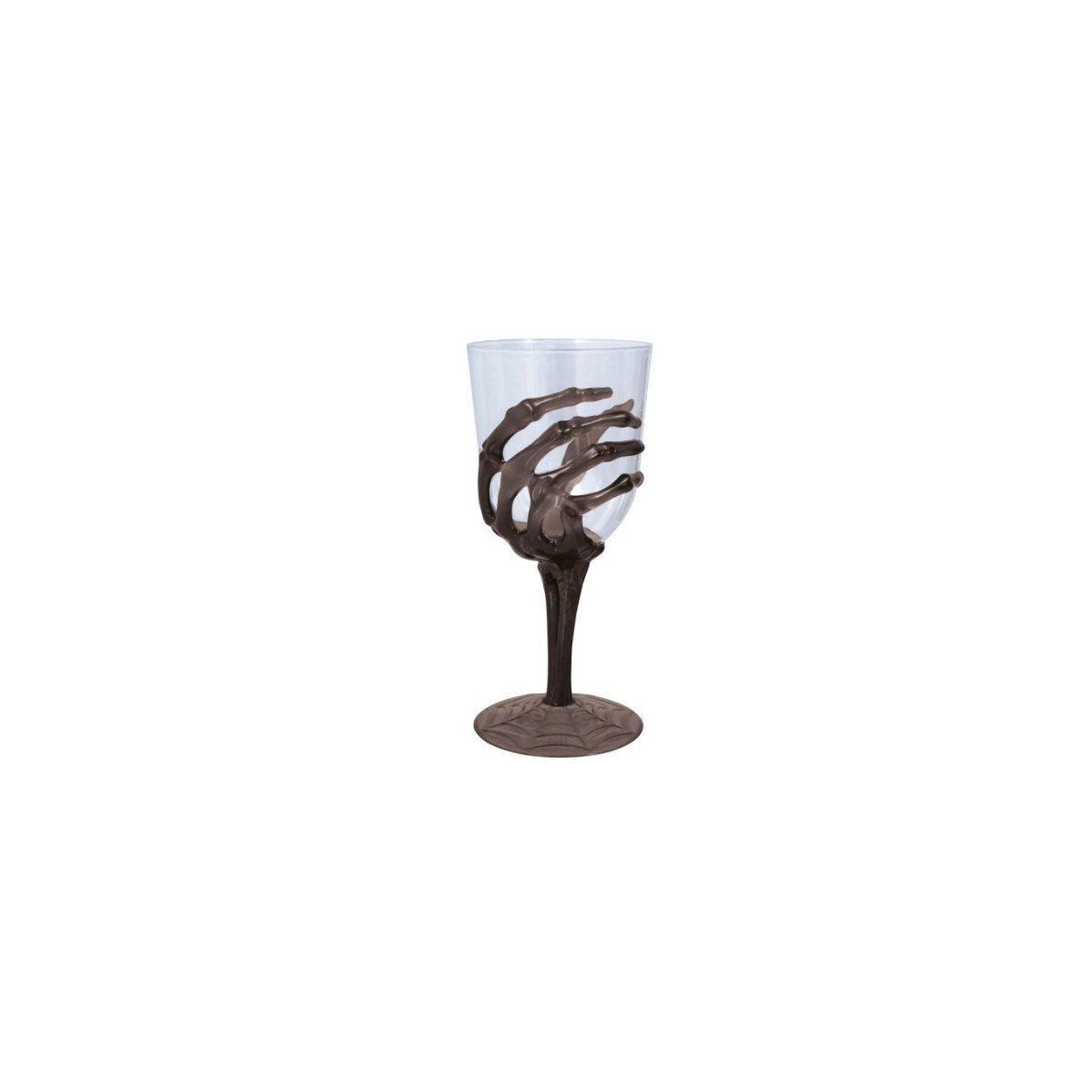 La mesa en Halloween puede tener un toque especial con esta copa de vino transparente con mano de esqueleto.