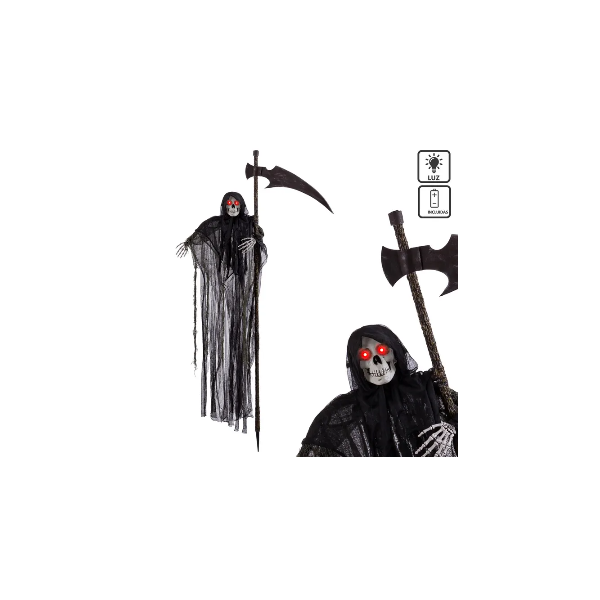 Conviértete en el terror de la noche con esta impresionante figura de la Muerte con guadaña, perfecta para decorar y dar miedo en cualquier ocasión especial.