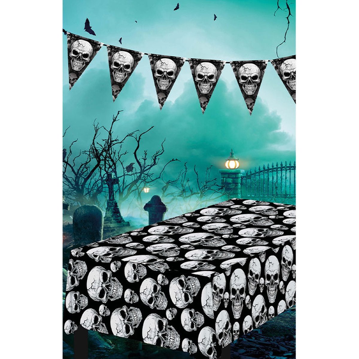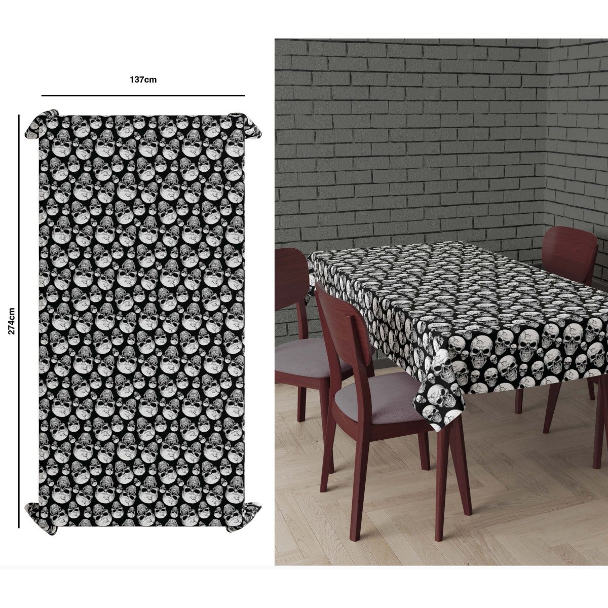 Mantel Calaveras 137x274 Cm con diseño de calaveras espeluznantes. Ideal para llenar mesas con ambiente terrorífico en Halloween o fiestas temáticas.