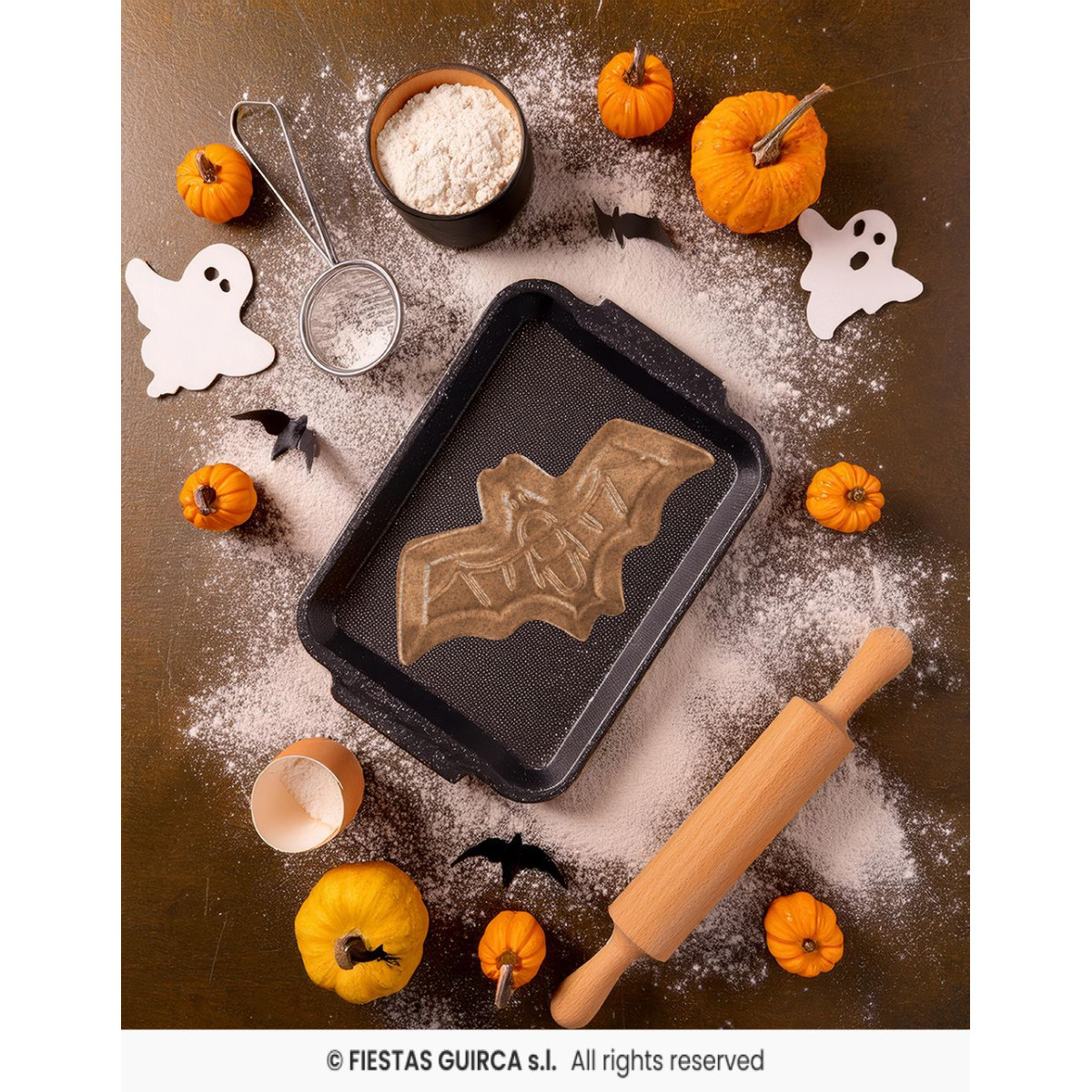 Molde de aluminio murciélago 32×19 cm. Ideal para bizcochos y postres de Halloween, resistente, reutilizable y fácil de limpiar.