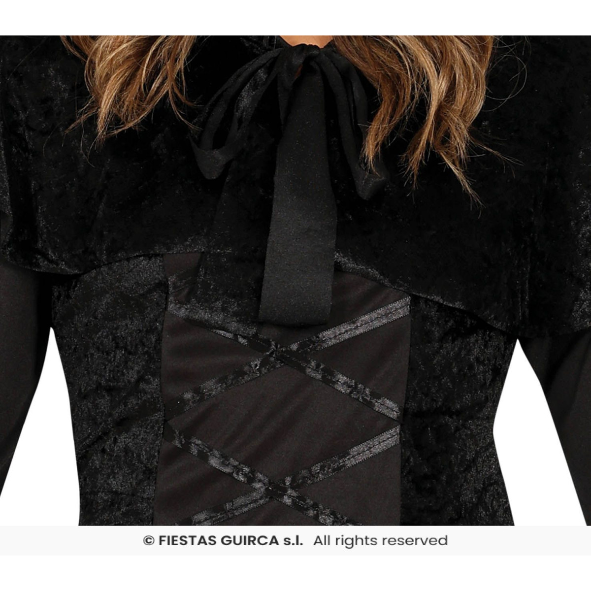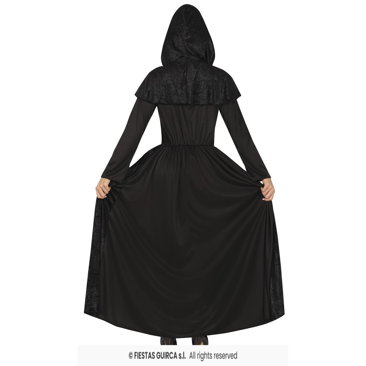 El conjunto incluye un vestido que se ajusta con elegancia, acompañado de una capa y una capucha que aportan un aire enigmático y siniestro. La capucha es el complemento perfecto para ocultar parte del rostro, aumentando la sensación de misterio y dando la impresión de que se trata de un personaje que surge de la oscuridad. El contraste entre la sobriedad del negro y el detalle espectral de la falda logra un acabado visualmente impactante.