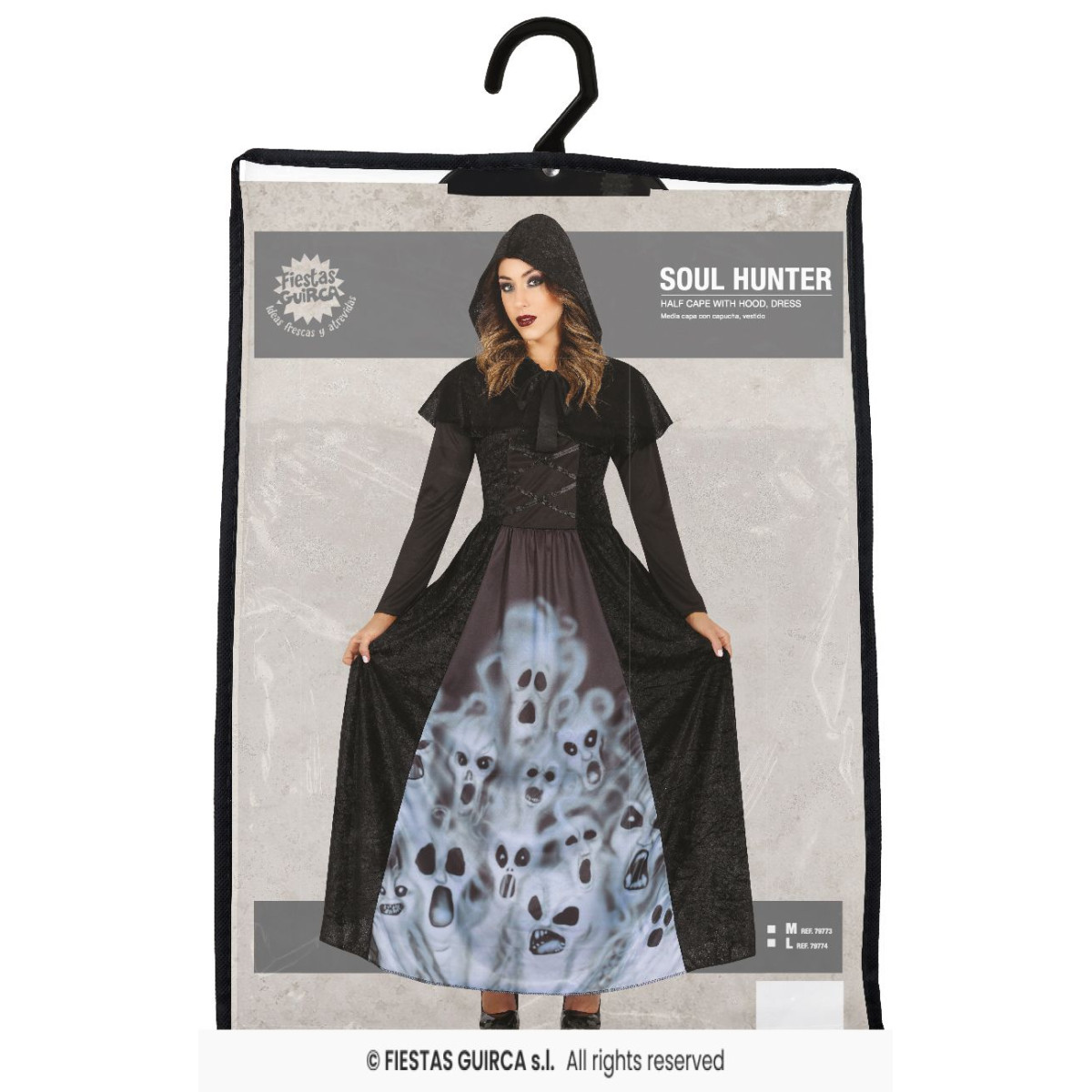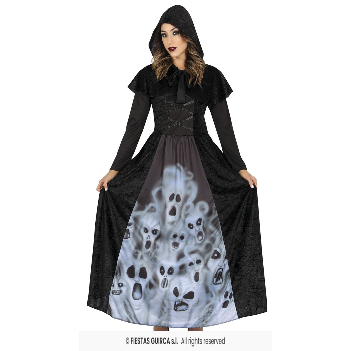 El Disfraz Cazadora De Almas en talla 38-40 es una propuesta ideal para quienes buscan un look oscuro y sobrecogedor en Halloween. Su vestido largo en tonos negros se combina con un estampado espectral en la falda, donde aparecen figuras fantasmales que refuerzan su estética aterradora. Esta mezcla de diseño convierte a quien lo lleva en una cazadora de almas digna de las historias más escalofriantes.