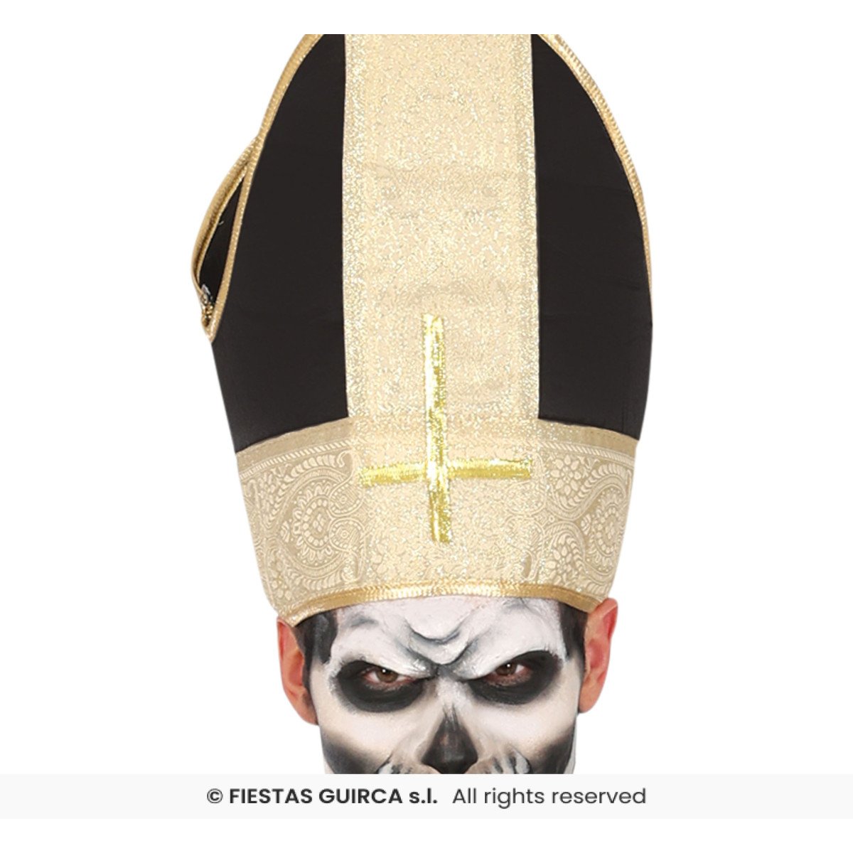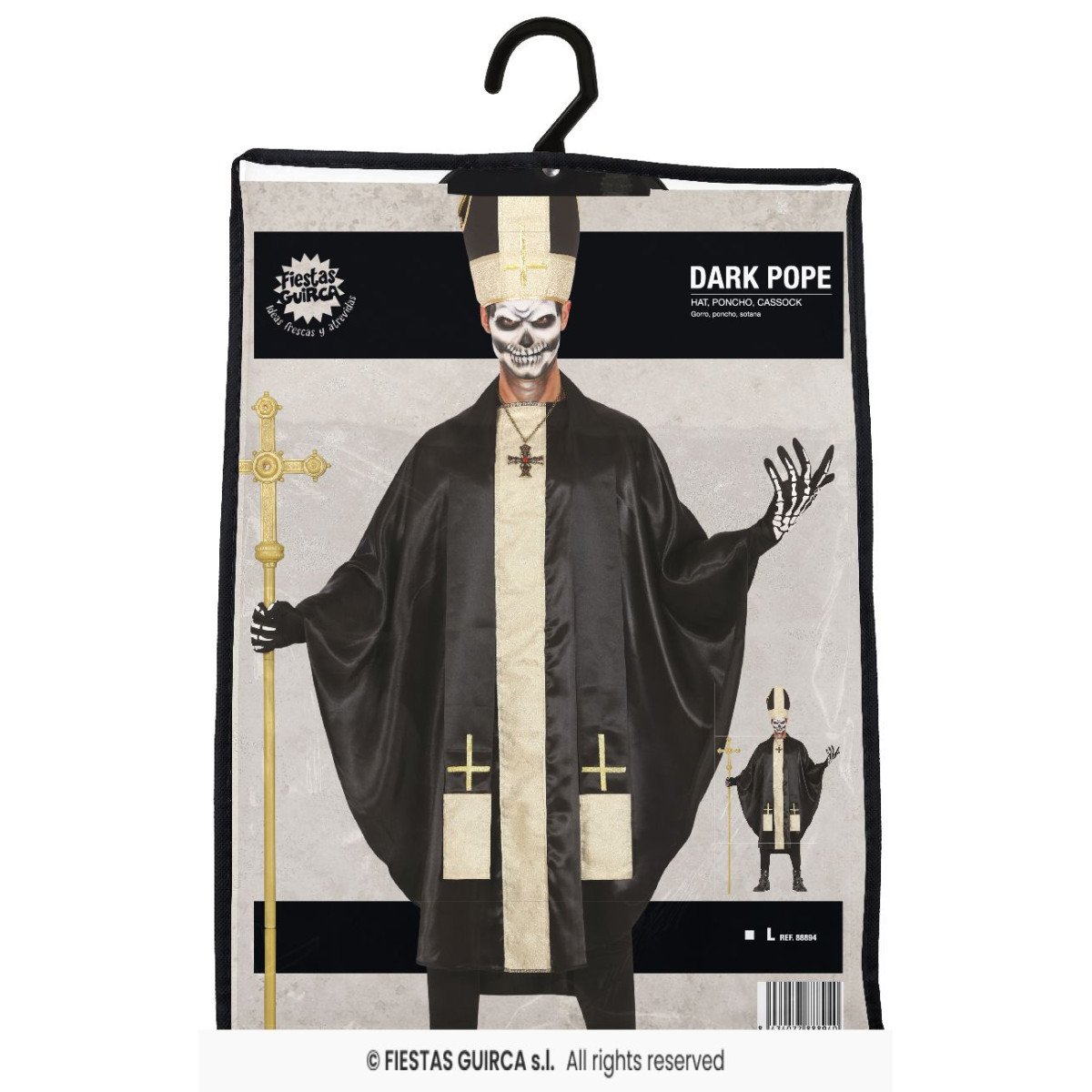 El Disfraz De Papa Oscuro Talla L es la elección ideal para quienes buscan un look imponente, original y con un toque siniestro en Halloween. Inspirado en una figura oscura y misteriosa, este disfraz destaca por su diseño en negro con detalles dorados, que realzan su aire solemne y aterrador. Incluye una sotana larga, un poncho con símbolos cruzados y un gorro alto que completa el conjunto con un estilo impactante.