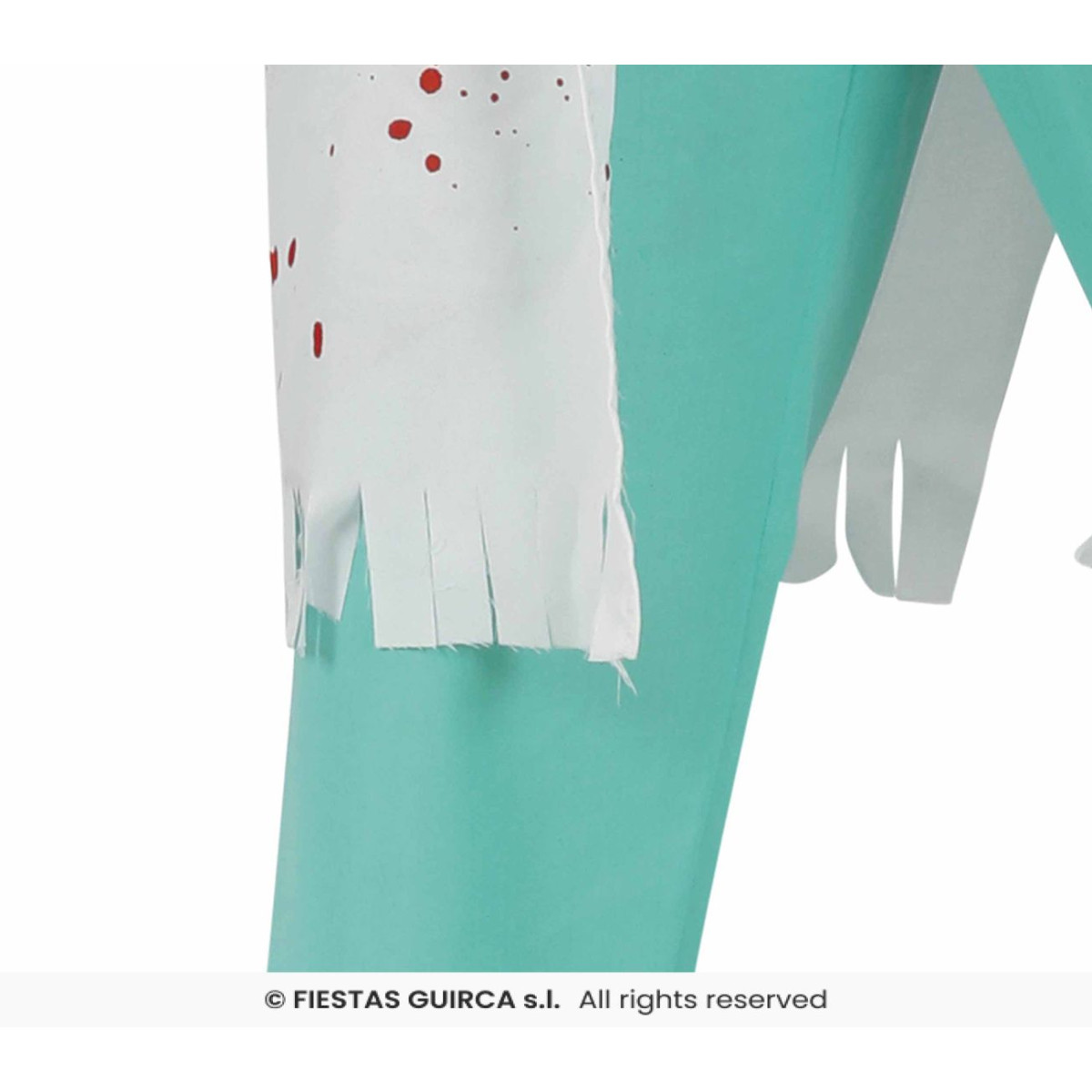 En la versión de talla 48-50, el conjunto resalta por su dramatismo. Los contrastes entre el verde médico y las manchas rojas crean un efecto impactante, reforzado por la bata desgarrada que añade un aire descuidado y escalofriante. La imagen resultante es perfecta para dar vida a un personaje que mezcla lo científico con lo monstruoso, ideal para cualquier fiesta de miedo.