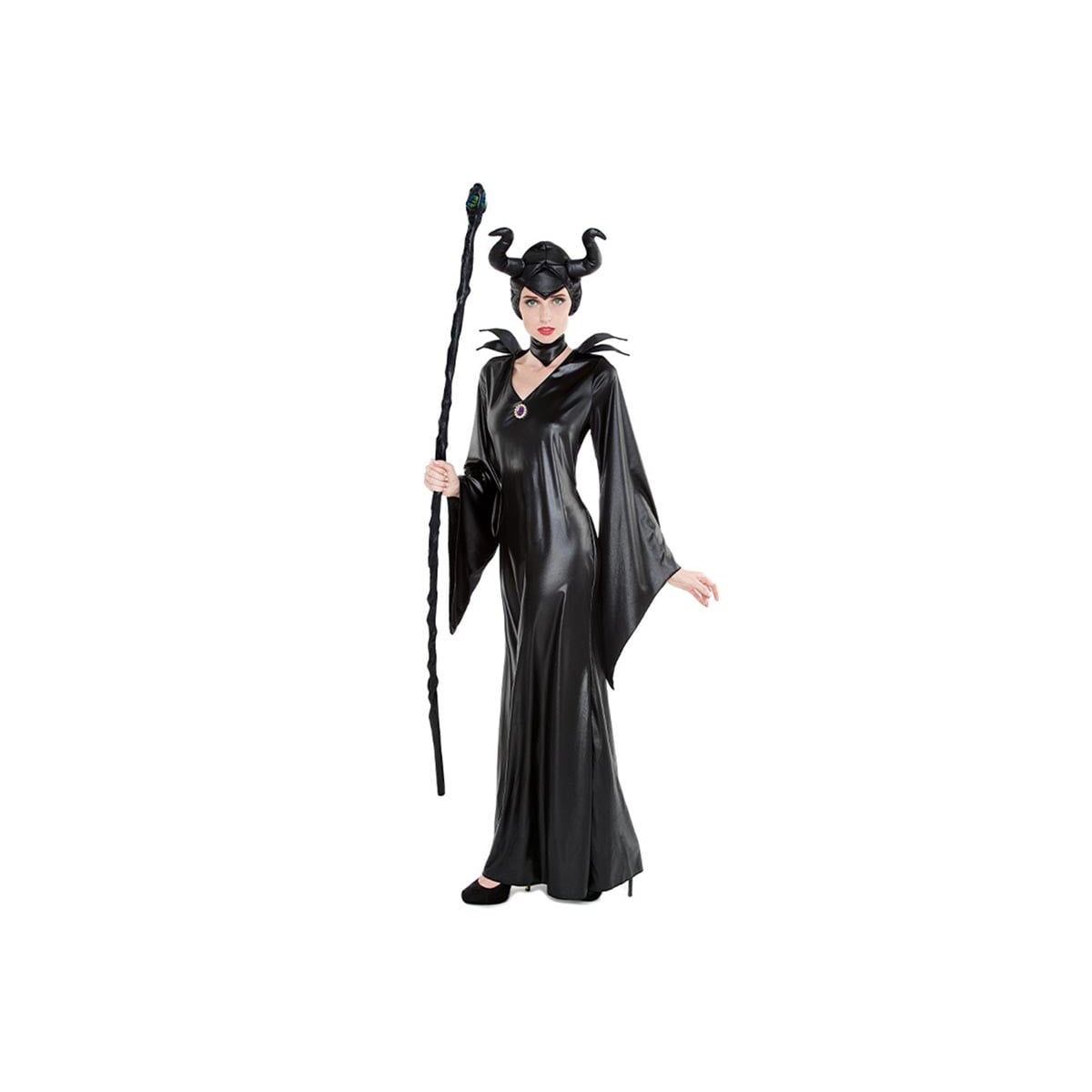 El vestido largo aporta elegancia y dramatismo, con un diseño que evoca a las villanas más icónicas de los cuentos clásicos. Su cuello rígido en forma de pico enmarca el rostro con un aire intimidante y majestuoso, mientras que el gorro con cuernos acolchados se convierte en el símbolo de poder absoluto. La combinación de estos elementos crea un disfraz que no necesita más para transmitir la esencia de un personaje inolvidable.