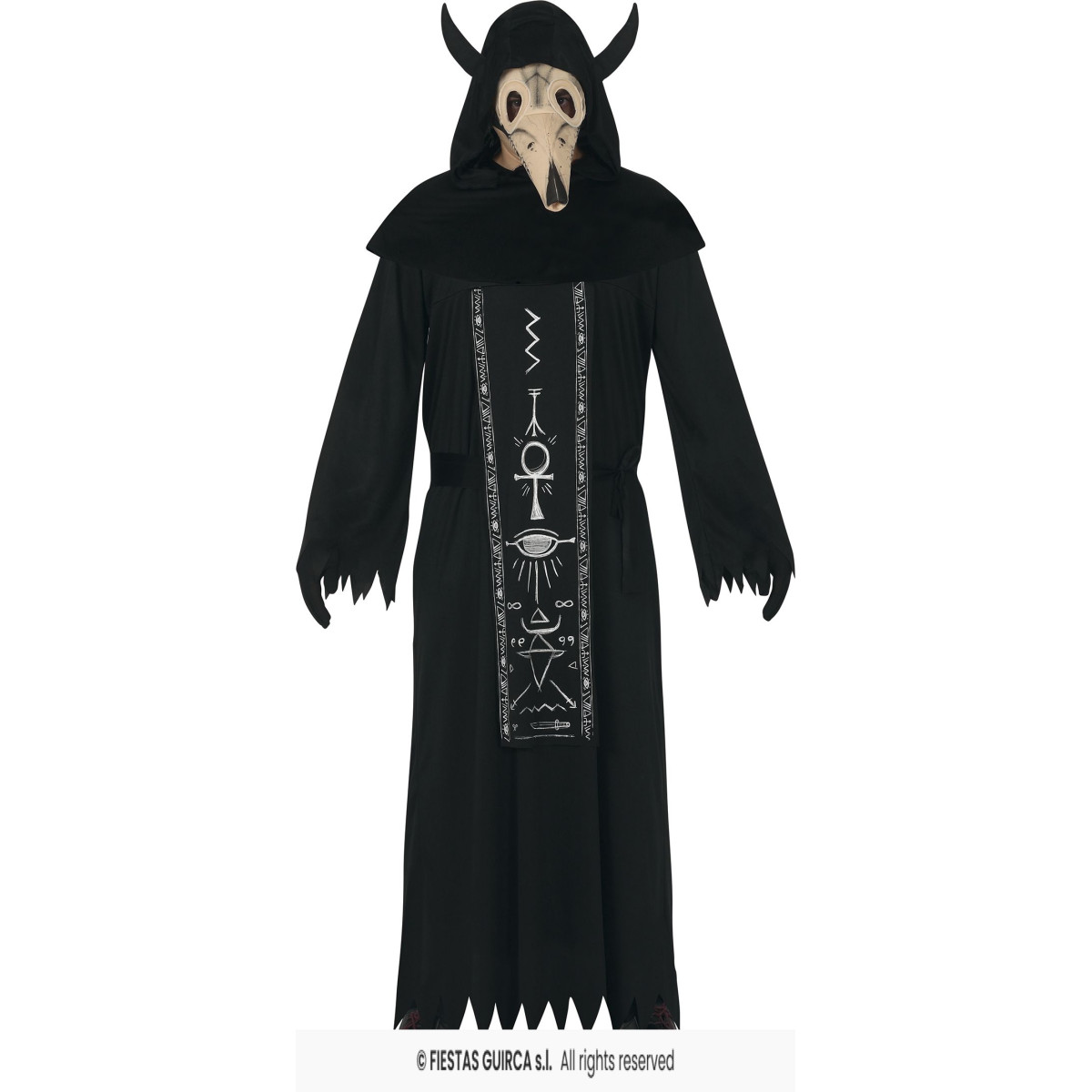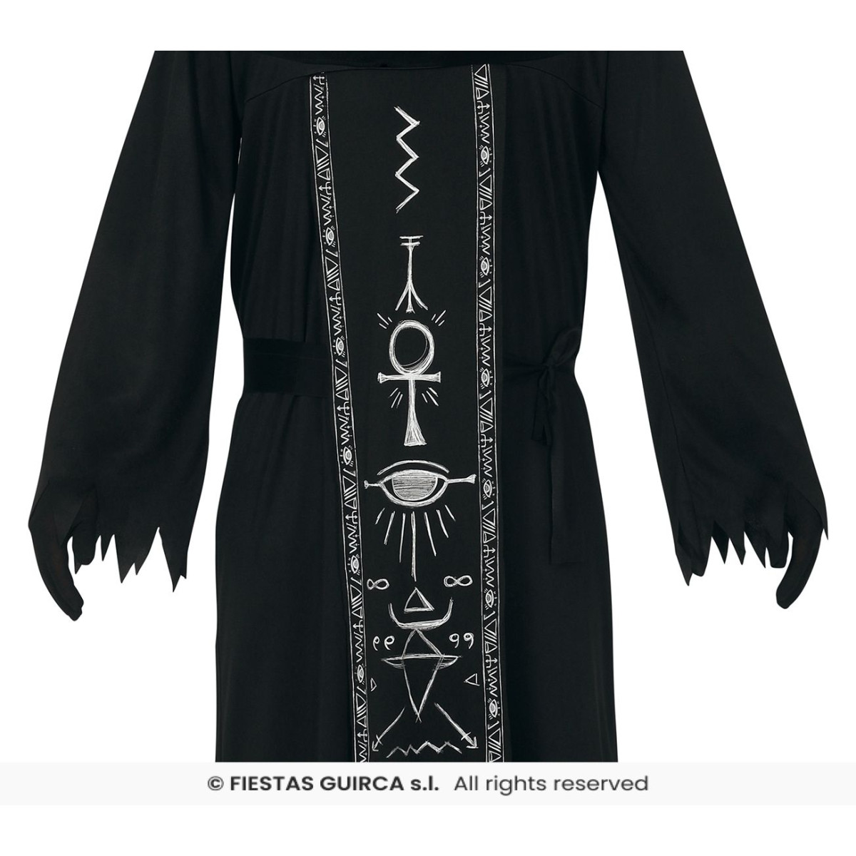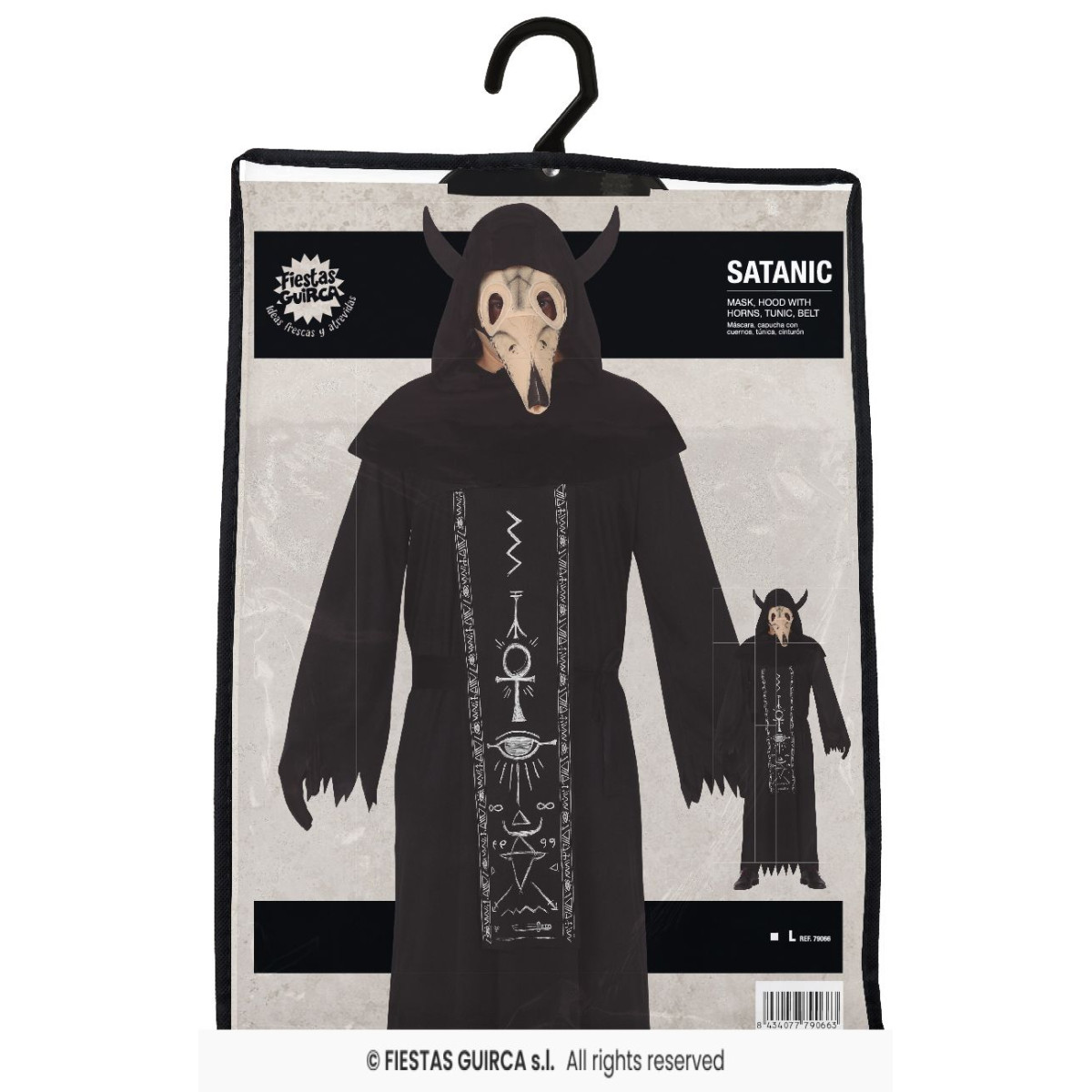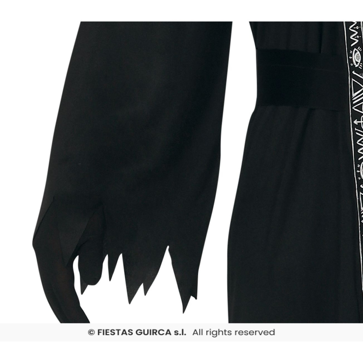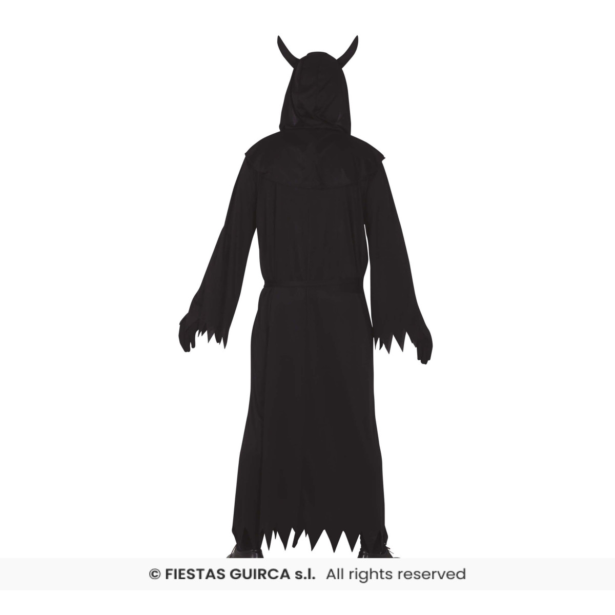 En la versión de talla 52-54, el traje resalta la teatralidad de un atuendo pensado para impresionar. La caída de la túnica y la amplitud de sus mangas refuerzan el dramatismo de cada movimiento, mientras que la máscara con cuernos aporta un aire demoníaco inconfundible. El cinturón con inscripciones añade detalle al conjunto, evocando una atmósfera ritual que potencia el carácter macabro del disfraz.