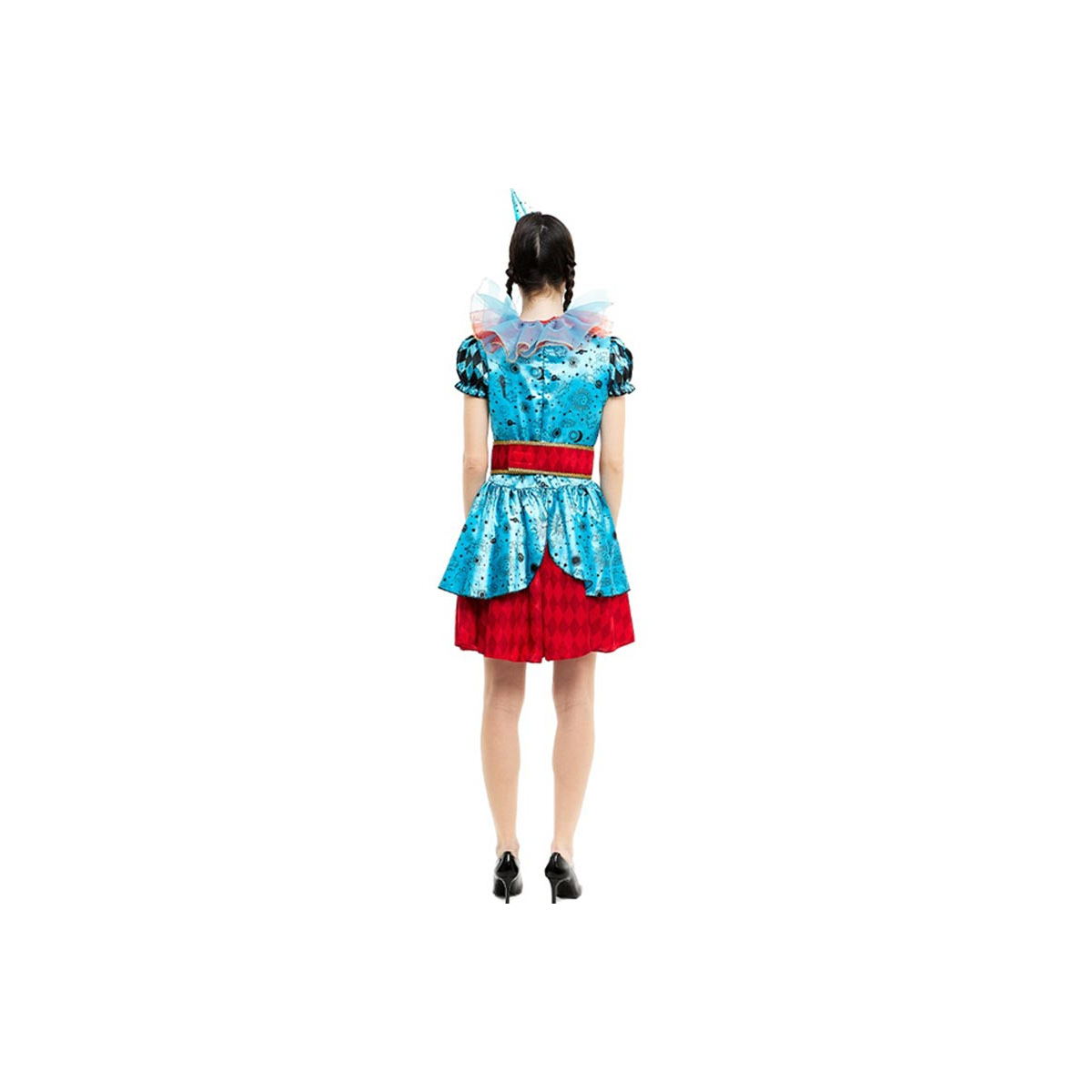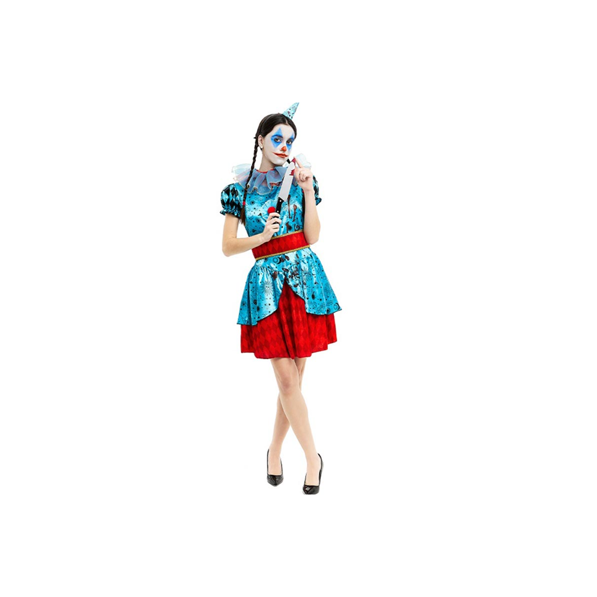 Este Disfraz Payasa Maniaca talla S te convierte en la reina del circo del terror. El vestido combina paneles azul y rojo con volantes, tirantes y rayas desordenadas que evocan locura teatral. La costura de la falda está intencionadamente dispareja para dar un aire perturbador, mientras los detalles como botones exagerados y telas contrastadas suman caos controlado.
