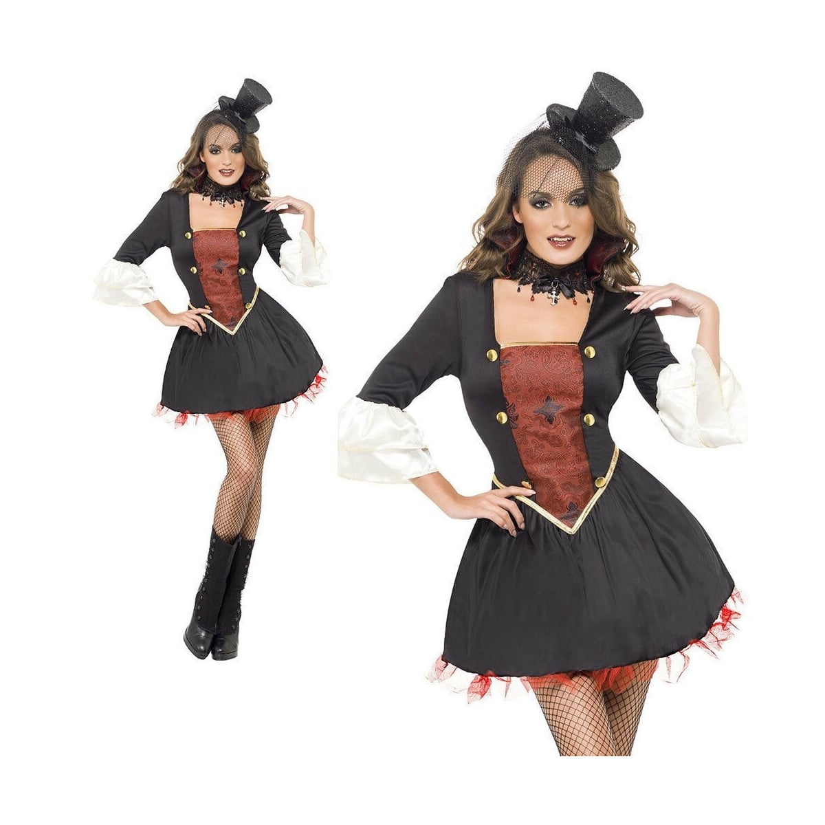 El Disfraz de Vampiresa cuenta con un vestido con cuello que imita un traje en su versión más sensual, collar y sombrero. No incluye otros accesorios.