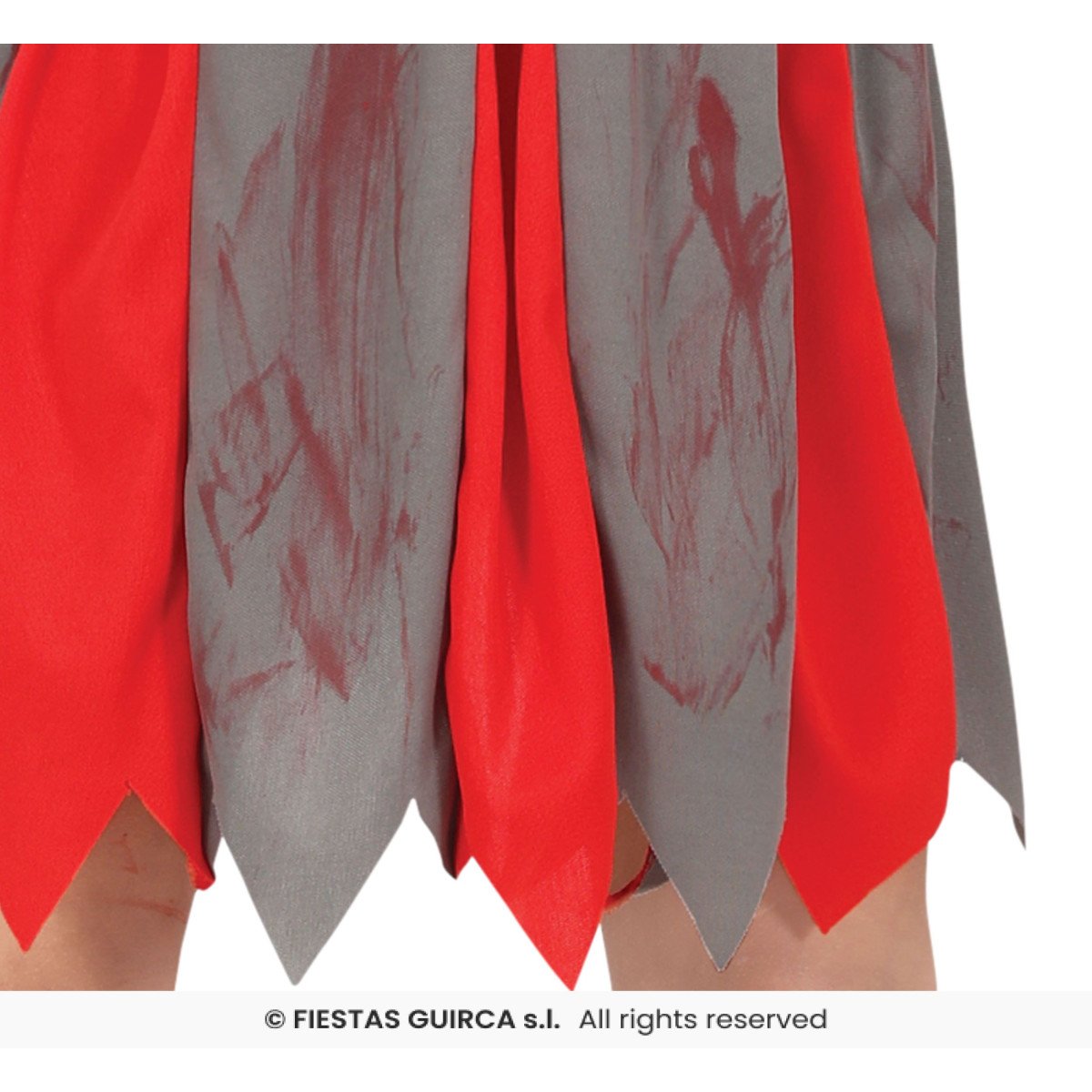 Este modelo en talla 10-12 años incluye un vestido con efecto desgarrado, manchas de sangre falsa y un diseño que mezcla el estilo clásico de animadora con un toque aterrador. Es cómodo de llevar y perfecto para moverse con libertad durante toda la noche.