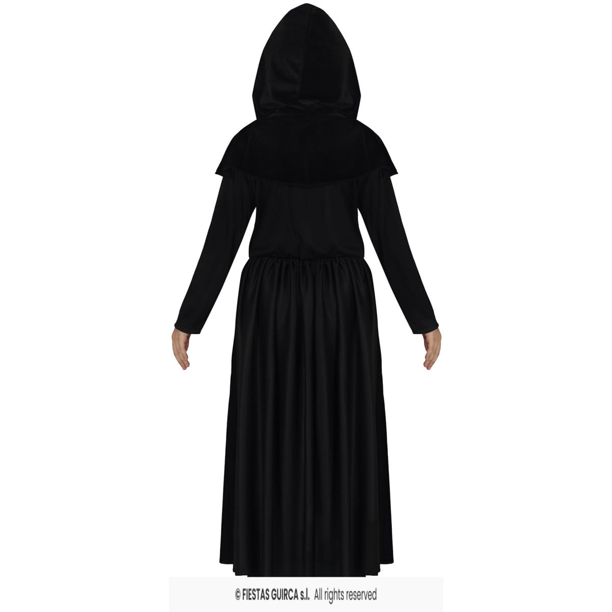 Incluye vestido largo, capa y capucha, creando un look impresionante que no pasará desapercibido. Su diseño negro con detalles tenues en la falda transmite un aire enigmático, mientras que la capucha aporta ese toque siniestro que encanta en las fiestas. Además, su tejido ligero y suave permite moverse con comodidad durante toda la celebración.