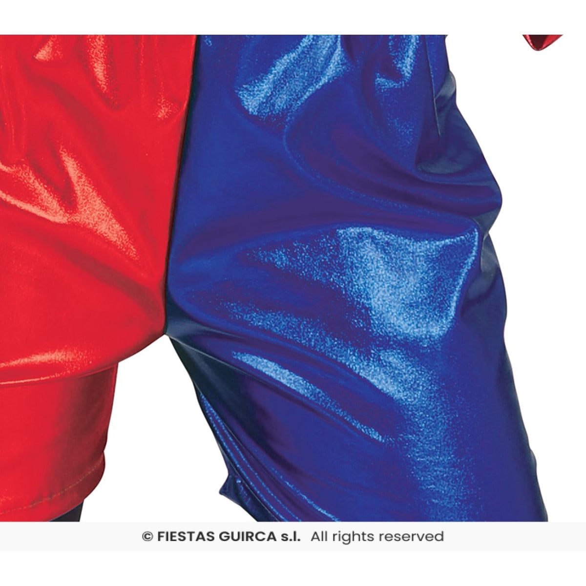 El Disfraz Harley Quinn es la elección perfecta para las primeras fiestas de disfraces o carnavales donde la diversión y el brillo son protagonistas. Esta versión para talla 3-4 años combina una chaqueta metalizada bicolor en rojo y azul, un pantalón a juego y una camiseta con estampado que completa un look lleno de energía. Su tejido es ligero, cómodo y permite moverse sin dificultad, ideal para niñas y niños que adoran bailar, correr y jugar.