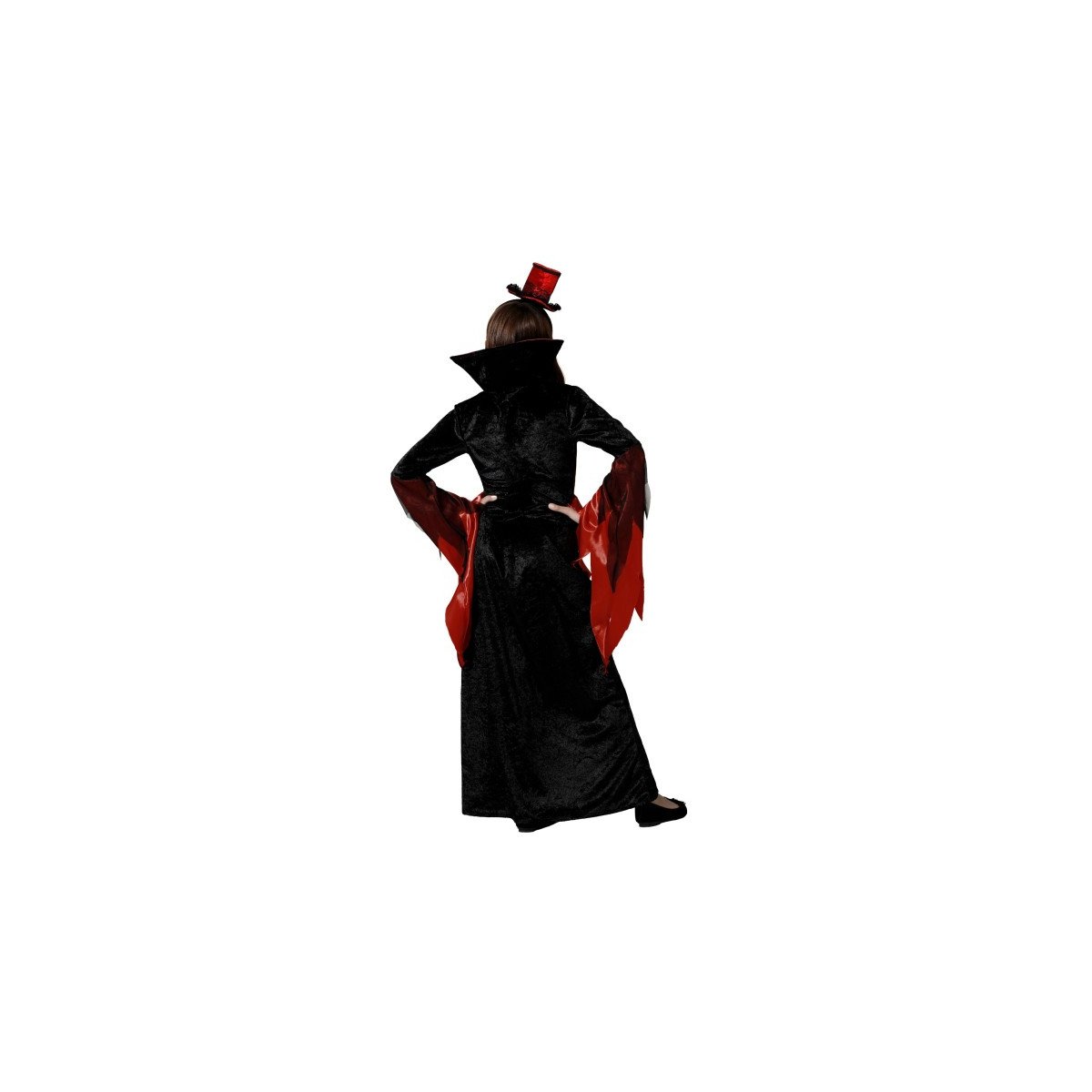 Está disponible en diferentes tallas para adaptarse perfectamente a cada niña, garantizando comodidad durante toda la celebración. Se puede complementar con colmillos postizos, un peinado elegante y maquillaje oscuro para un resultado de auténtica reina vampírica.