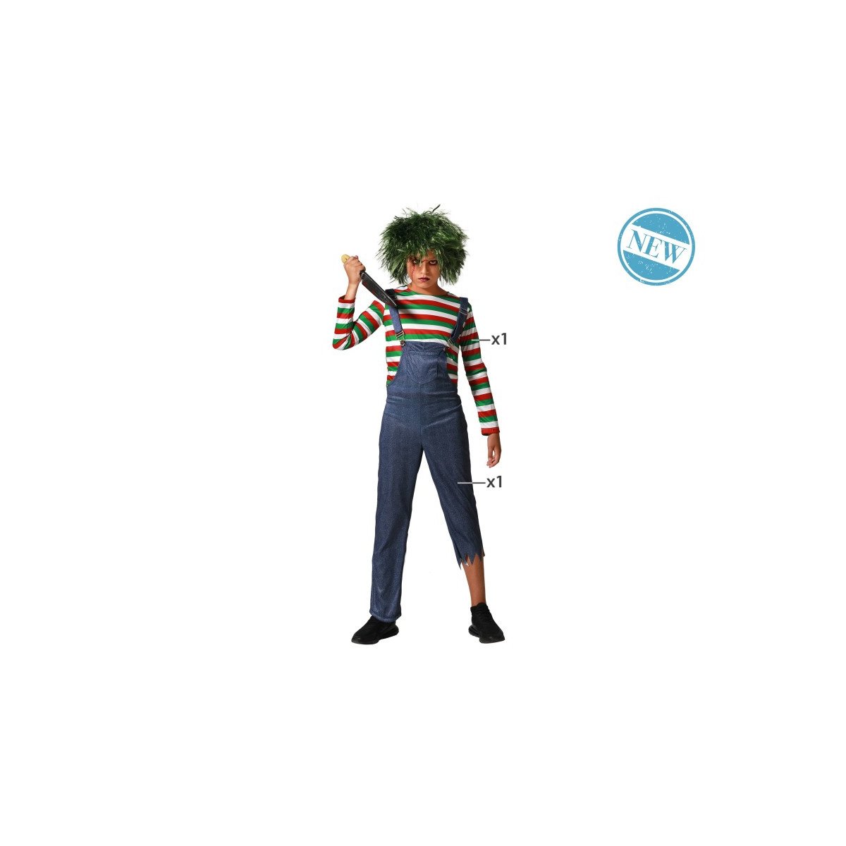 Este disfraz infantil de muñeco maldito es perfecto para causar sensación en Halloween con un look terrorífico y original. El conjunto incluye una camiseta de manga larga con rayas rojas, verdes y blancas, y un peto con efecto vaquero que completa el estilo clásico de un personaje inquietante. Su diseño permite moverse cómodamente y es muy fácil de poner y quitar, ideal para fiestas escolares, eventos temáticos o celebraciones familiares.