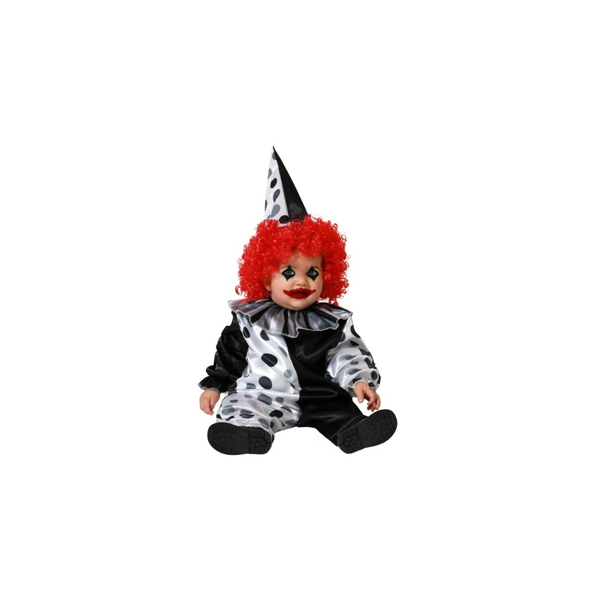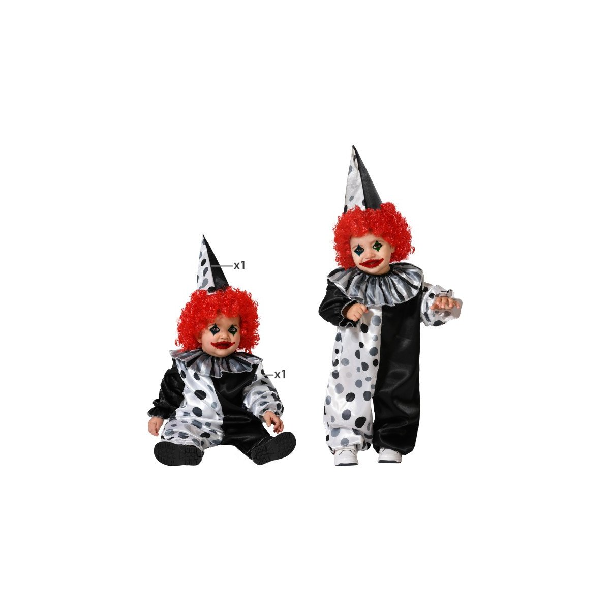 Este disfraz de payaso terrorífico está pensado para que tu bebé viva su primera noche de Halloween de forma cómoda, divertida y muy original. Su diseño combina un clásico estampado de lunares en blanco y negro con un acabado brillante que llama la atención sin resultar incómodo ni recargado. Incluye un mono suave y ligero de una sola pieza que se coloca fácilmente y un gorro a juego con forma de cono que aporta ese toque divertido y un poco travieso.