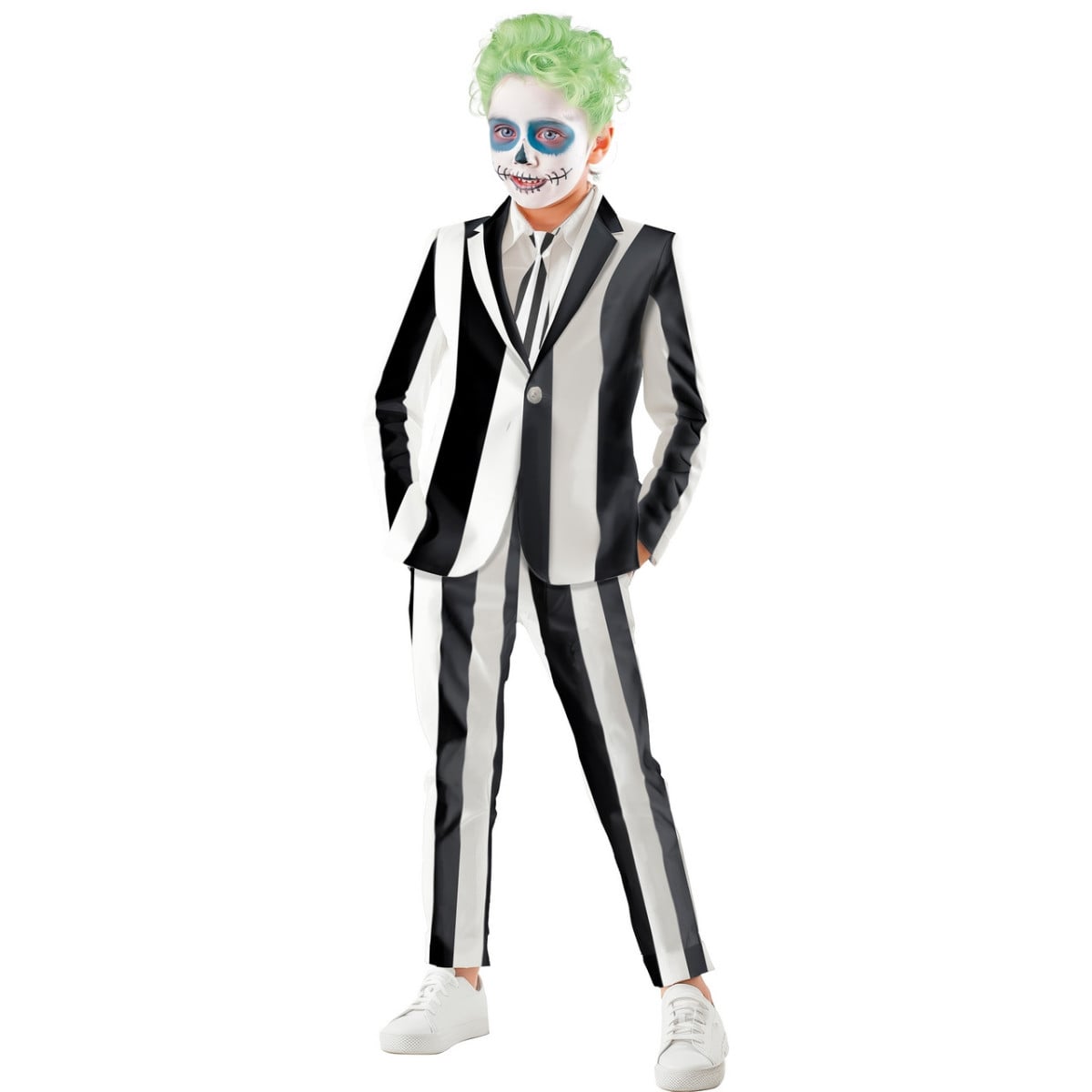 El disfraz infantil Fantasma Bitelchús es la elección ideal para los pequeños que adoran los personajes fantásticos y excéntricos. Inspirado en el famoso personaje de la película, este disfraz recrea fielmente el estilo inconfundible de Bitelchús con su traje a rayas blanco y negro. Los niños podrán disfrutar de una experiencia divertida y auténtica, siendo el centro de atención en cualquier evento. Perfecto tanto para fiestas de Halloween como para otras ocasiones especiales, este disfraz combina diseño y comodidad, permitiendo a los niños moverse y jugar libremente.