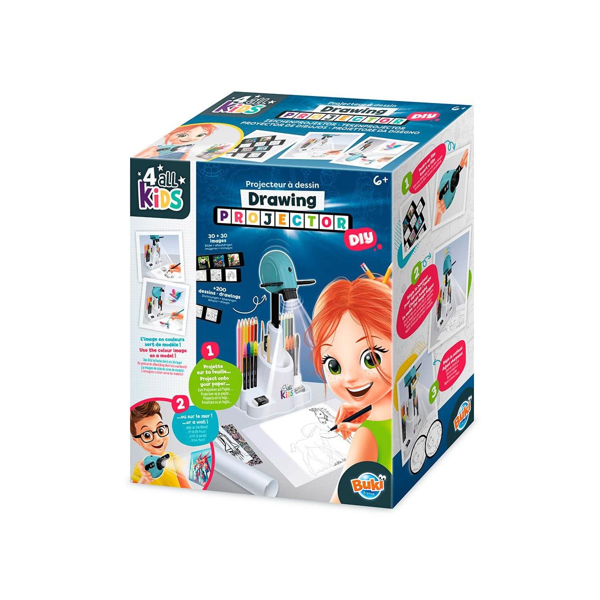 Proyector de dibujo Buki para niños y niñas desde 6 años. Permite proyectar imágenes para calcar y colorear, incluye 30 láminas con 200 motivos y material de dibujo para desarrollar creatividad y motricidad.