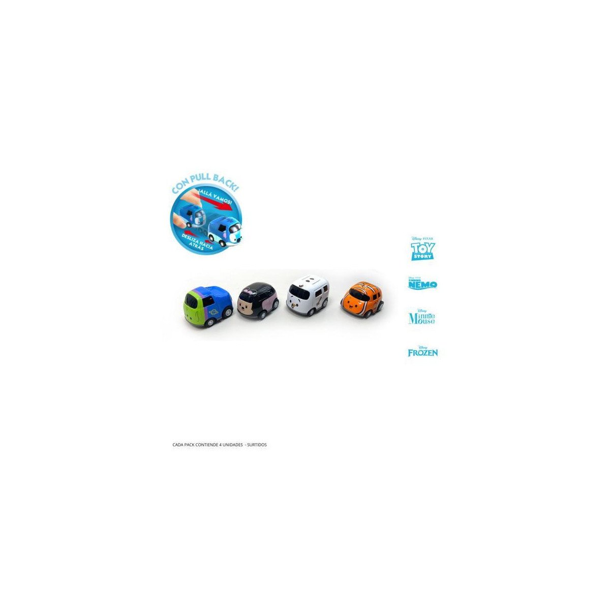 - Pack de 4 vehículos miniatura con diseños inspirados en los personajes más populares de Disney y Pixar.