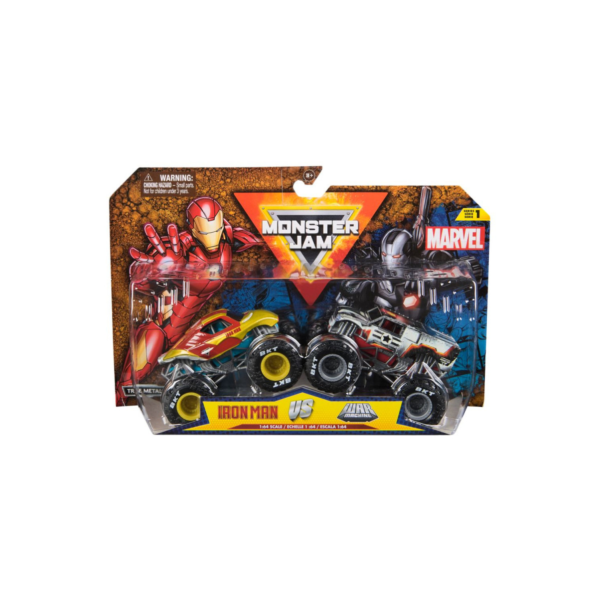 Cada camión está fabricado con carrocería metálica y ruedas grandes tipo BKT, características del mundo Monster Jam. Su escala 1:64 permite recrear espectaculares enfrentamientos y carreras llenas de acción.