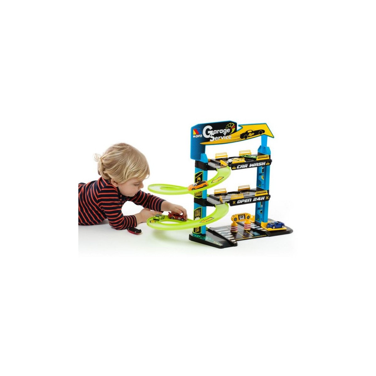 Incluye: Ascensor funcional para mover los coches entre niveles, pistas de carreras para emocionantes competencias y centro de lavado de coches y estación de servicio.