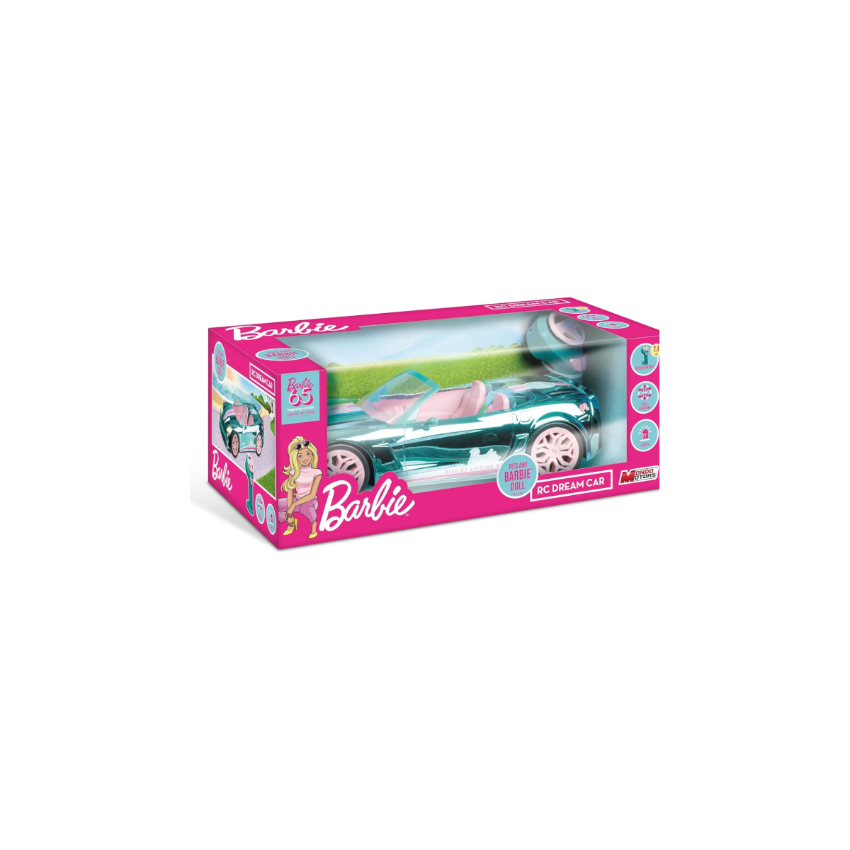 ¡Barbie celebra su 65 aniversario con estilo sobre ruedas! El Barbie Coche 65 Aniversario, a escala 1:10, es una edición limitada que combina el glamour inconfundible de Barbie con la emoción del radiocontrol. Ideal para niñas y niños a partir de 5 años, es el regalo perfecto para fans de la muñeca más icónica del mundo.