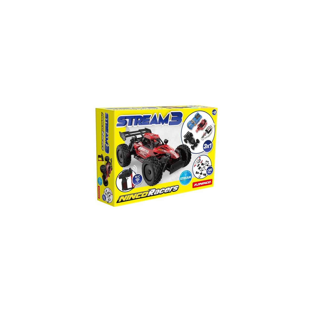 Construye y conduce el Nincoracers Stream 3: un coche Radio Control con más de 120 piezas y diseño resistente. ¡Diversión creativa y acción desde los 8 años!