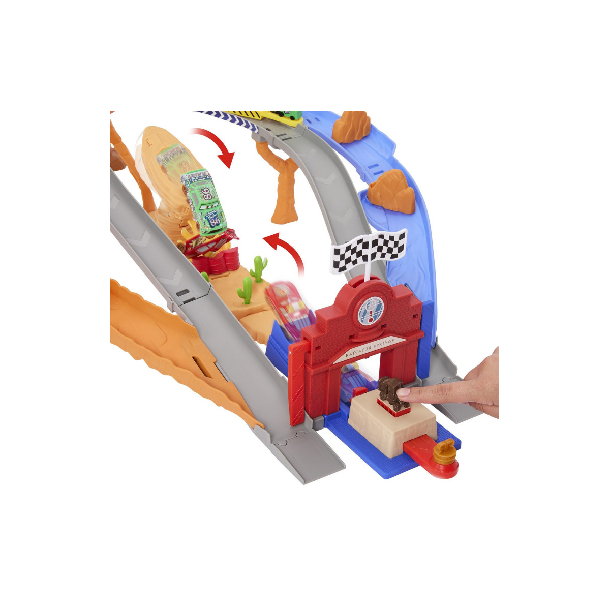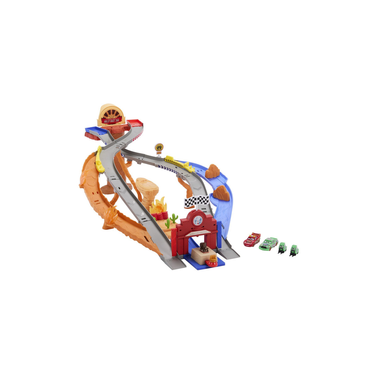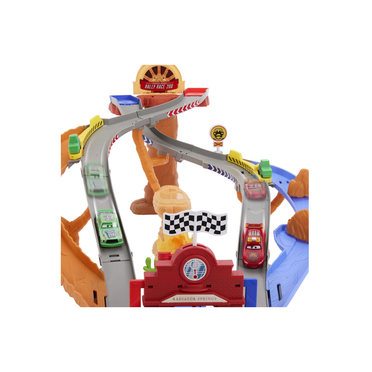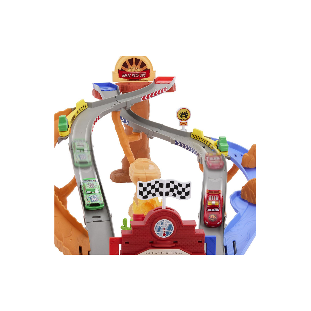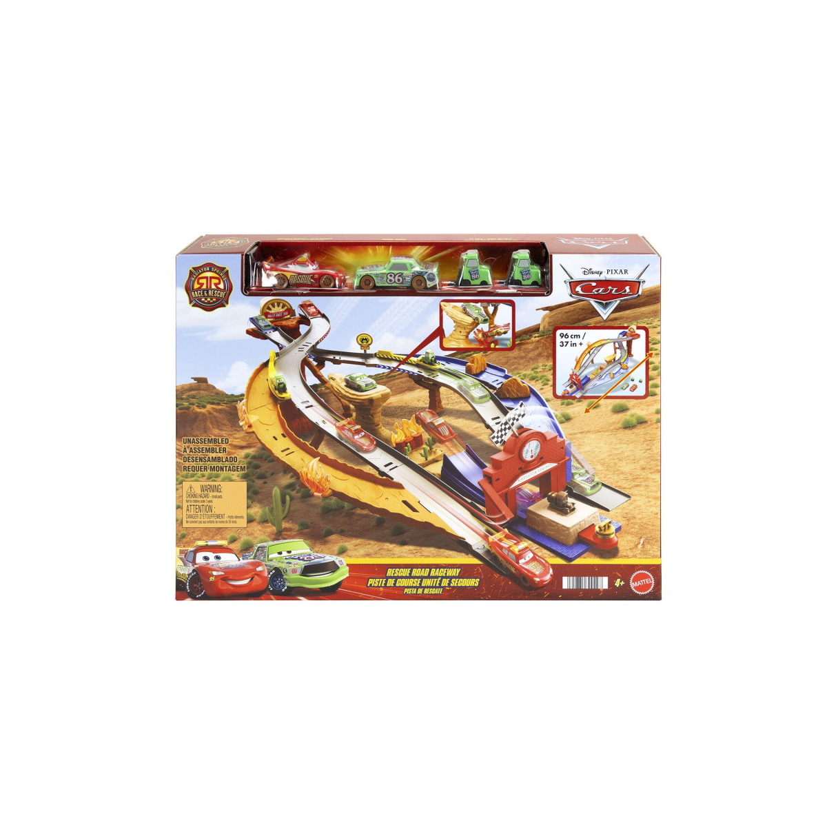 Descubre el Circuito Carreras Cars Radiador Springs; carreras, rescates y acción en miniatura con cuatro coches oficiales listos para girar, saltar y llegar a tiempo.