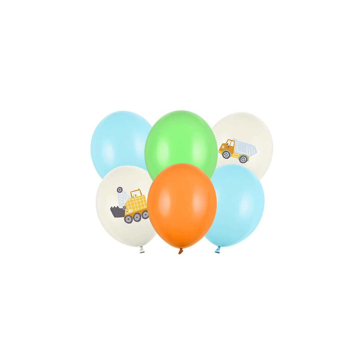Globos de construcción 30 cm con diseños de camiones y excavadoras. Aptos para aire o helio, ideales para decorar fiestas infantiles temáticas.