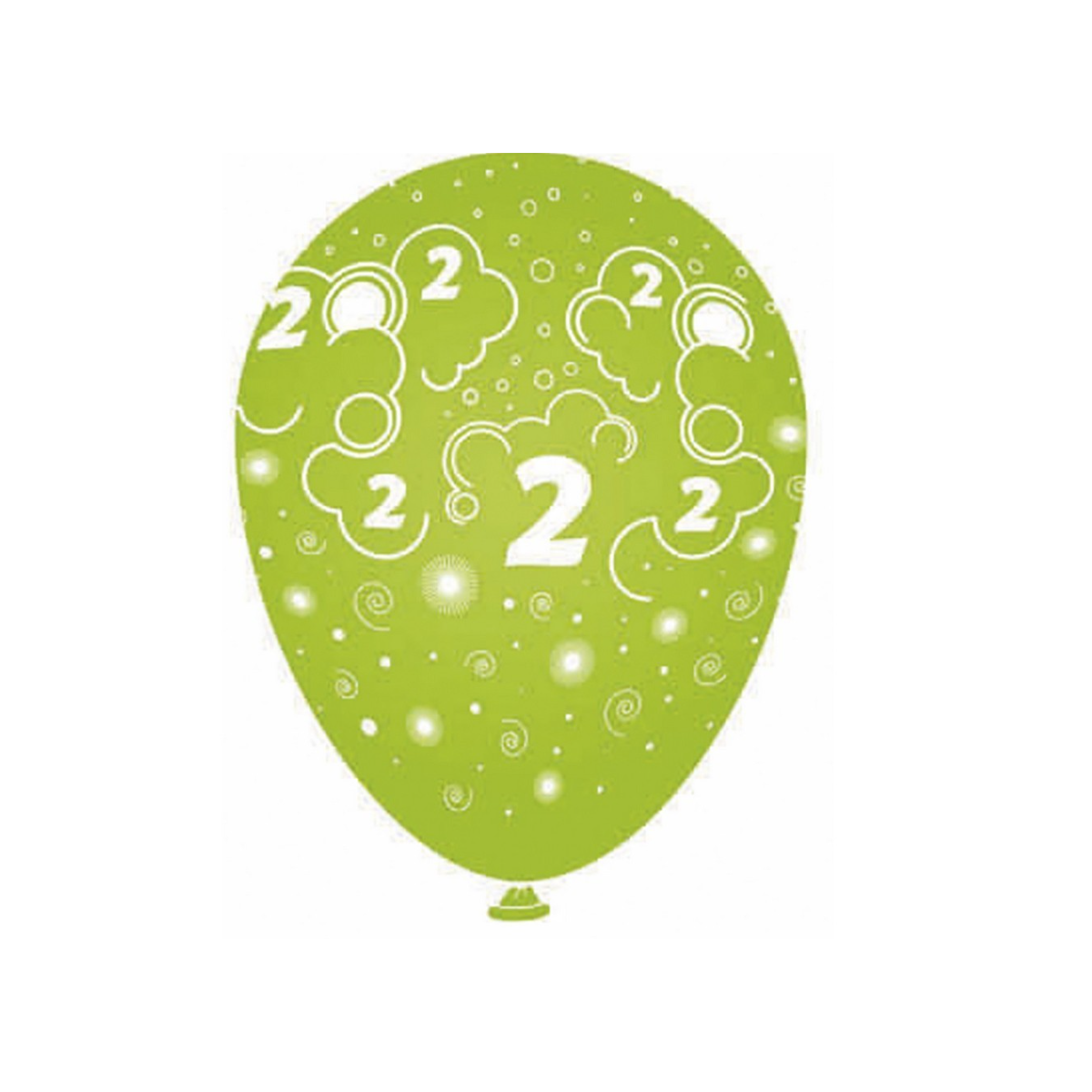 El pack incluye 6 globos de color verde vibrante con estampado blanco, en el que el número 2 aparece en diferentes tamaños rodeado de espirales, burbujas y detalles festivos. Puedes combinarlos con otros globos numéricos para formar fechas, edades o mensajes personalizados.