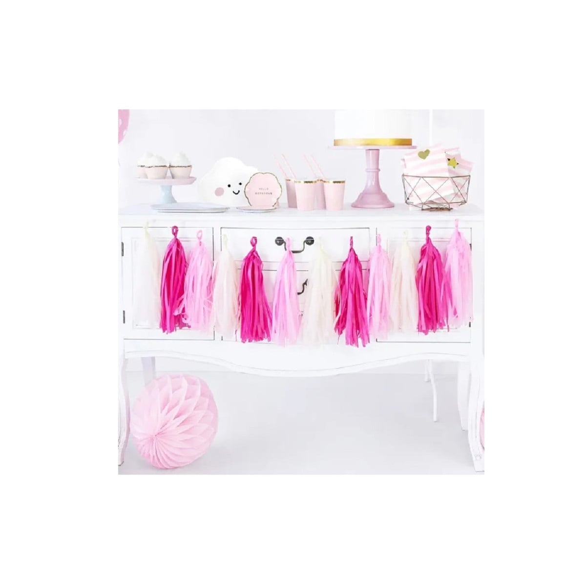 - Incluye: 12 borlas (4 crema, 4 rosa y 4 rosa fucsia) e hilo