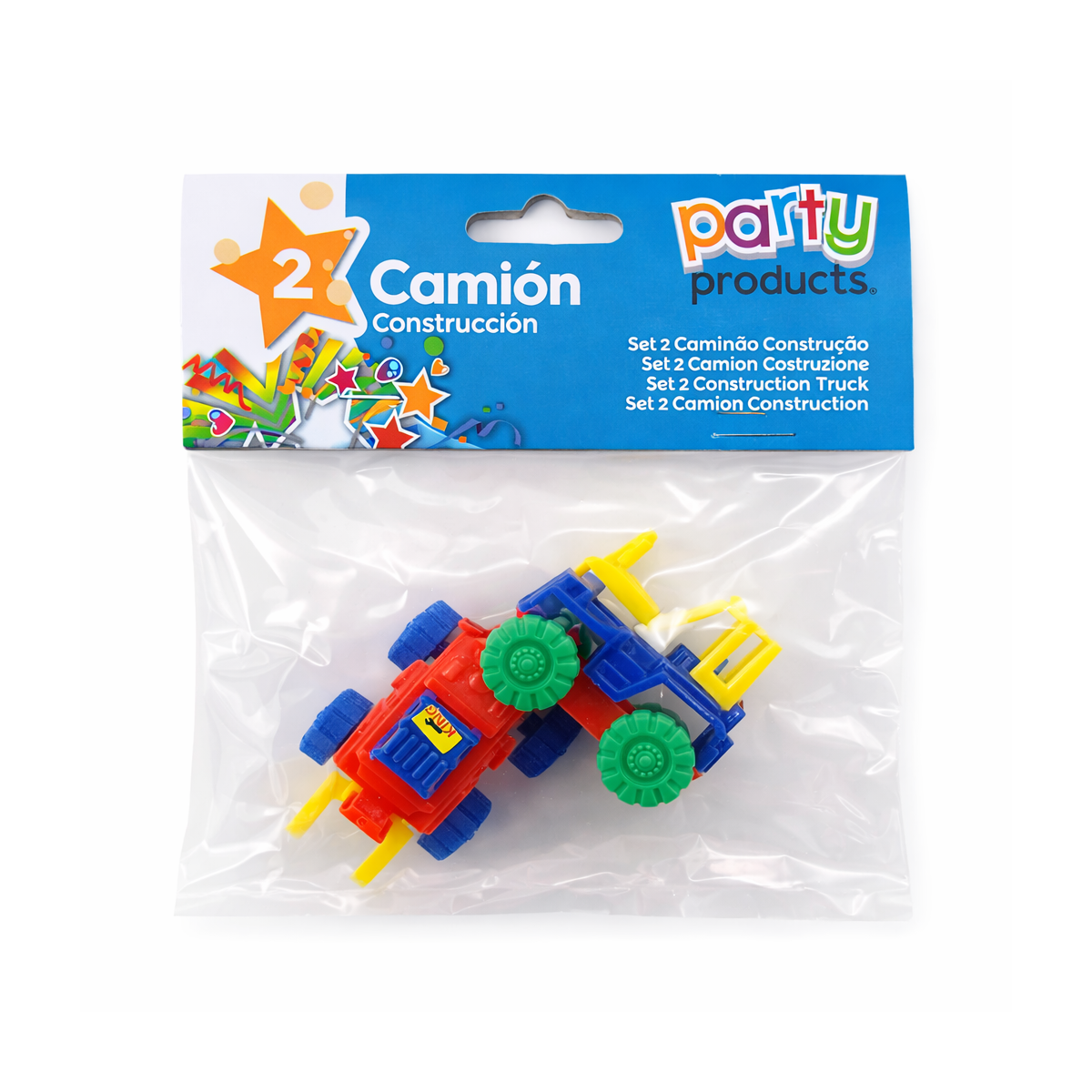 Set de 2 camiones de construcción en miniatura, ideales como detalle para fiestas infantiles. Un juguete divertido para niños y niñas que fomenta el juego imaginativo.