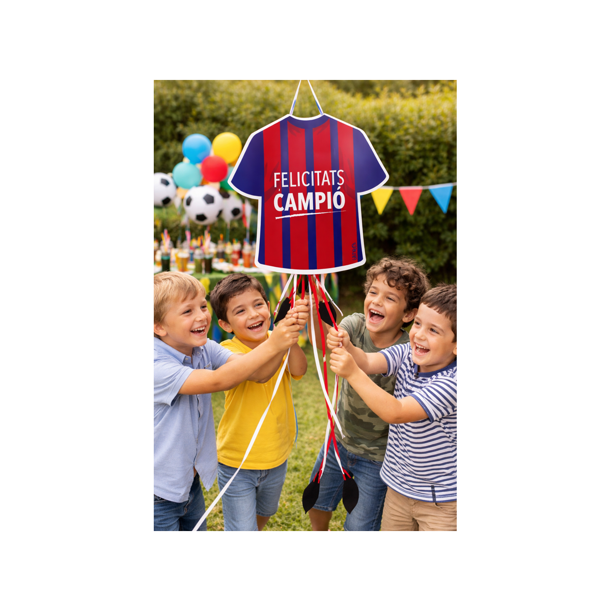 La Piñata Camiseta Fútbol Azul Y Granate es perfecta para celebraciones deportivas y fiestas de auténticos fans del fútbol. Con forma de camiseta y diseño en colores rojo y azul con el mensaje “Felicitats Campió”, se convierte en un elemento protagonista tanto en cumpleaños como en celebraciones de victoria o fin de temporada.