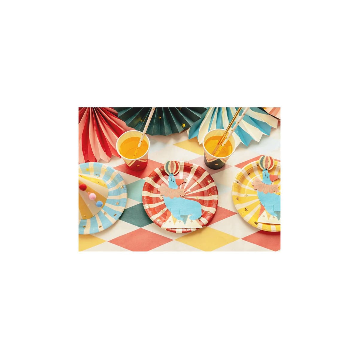 Decora tu mesa con los Platos Cartón Rayas Circo. Pack de 6 platos de cartón con diseño de rayas multicolor, ideales para fiestas temáticas. ¡Resistentes, desechables y biodegradables!