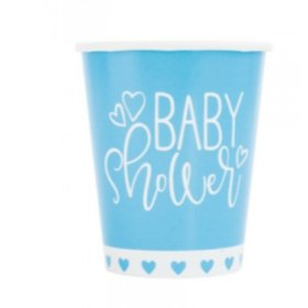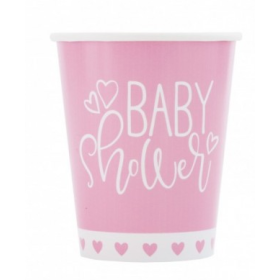 Vasos de papel para baby shower con corazones rosas. Pack de 8 unidades, resistentes y adorables, ideales para una fiesta llena de ternura.