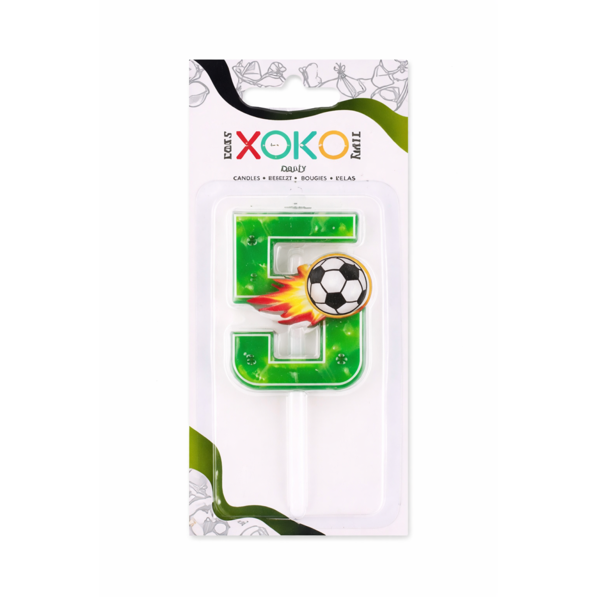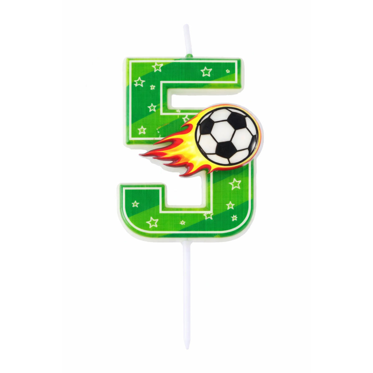 Descubre la Vela De Cumpleaños Número 5 Fútbol, con diseño de balón y efecto de movimiento. Perfecta para celebrar cumpleaños de pequeños aficionados al fútbol.